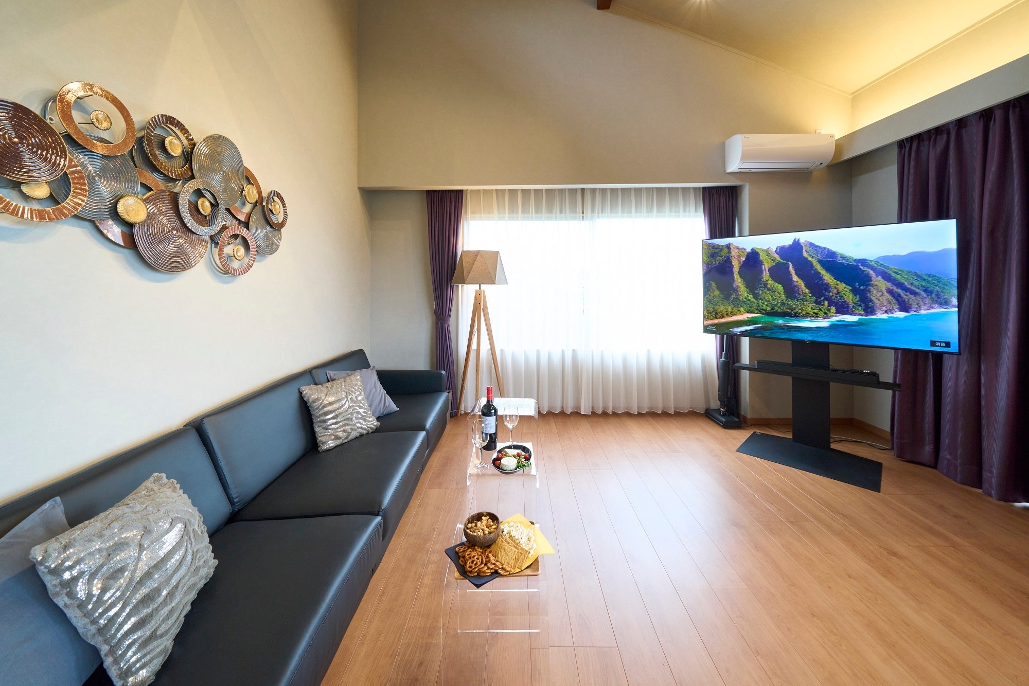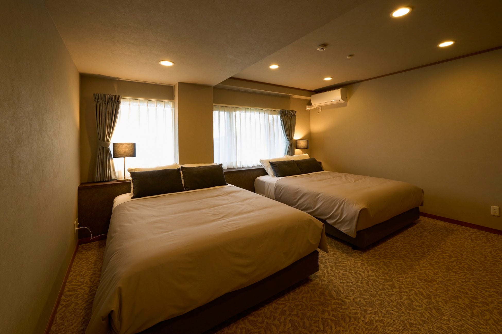 クイーンサイズベッドを使用した客室は2名~最大4名で利用可能です。その客室は、余計なものを配置せず、心身ともに安らげることを追求しました。厚さ270㎜のマットレスと255㎜のボトムクッションを組み合わせた床高525㎜のベッドは、寝起きしやすく身体を包み込み、深い眠りを提供します。翌朝は朝日に照らされた相模湾が、異なる表情を見せてくれます。隣接には8畳のモダン和室を設けており、大人数利用でも高い利便性を実現しています。