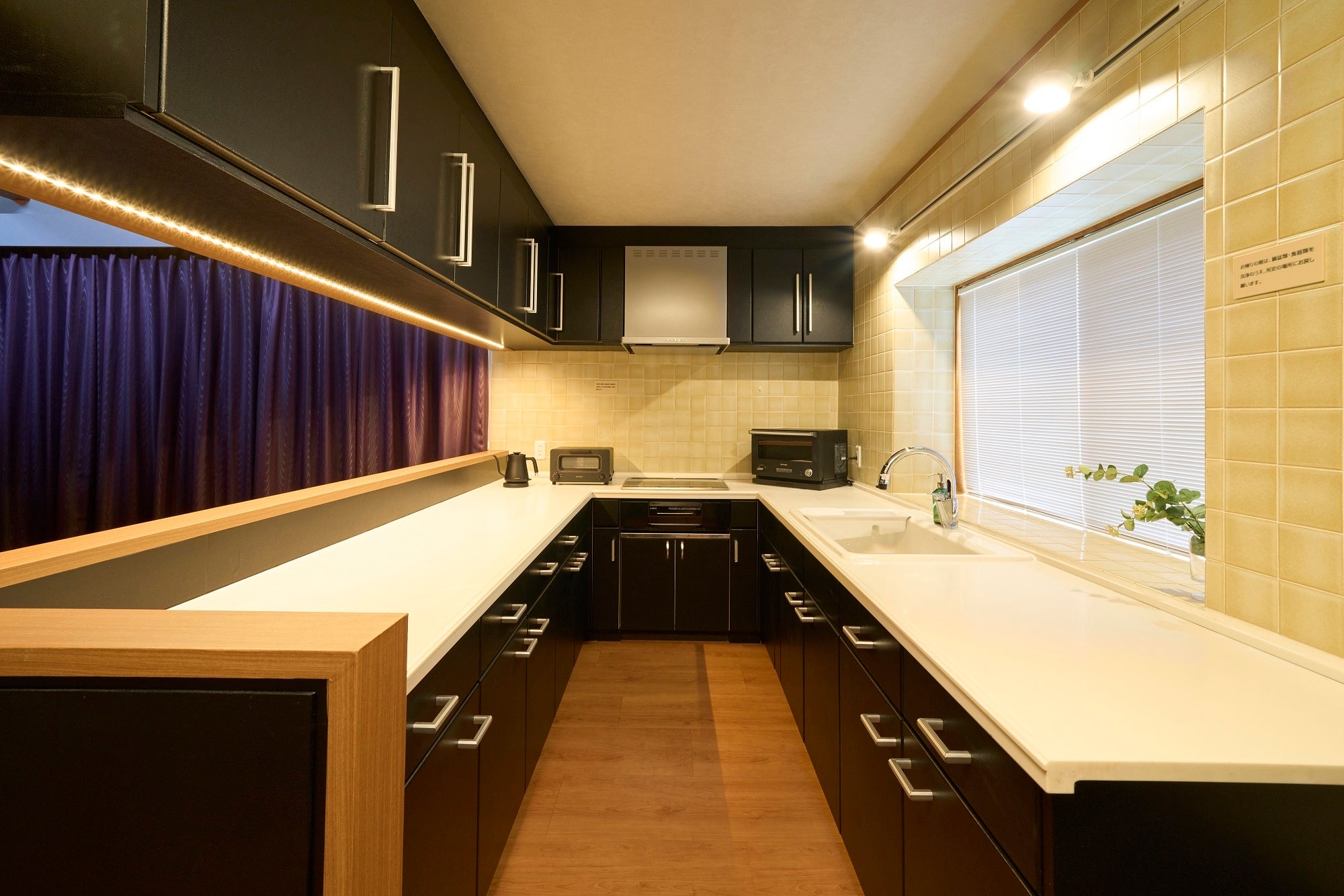 リビングダイニングへ対面ながら半独立型の大きなキッチンは、料理をレジャーとして楽しむ、出張シェフによる一流料理を創作してもらう、ウッドデッキでの料理の下ごしらえをする、どんなシチュエーションでも対応可能な広さと、家電をご用意しました。