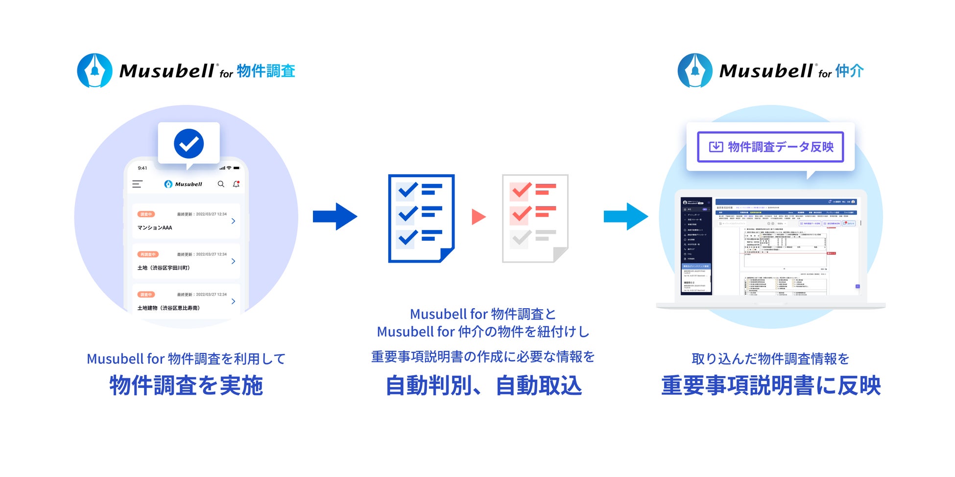 そのひとつとして、不動産取引の際に実施する物件調査業務に特化した「Musubell for 物件調査」(https://www.musubell.com/survey/)を利用して調査を行った情報を、「Musubell for 仲介」の重要事項説明書作成機能にデータ連携する新機能の開発を進めており、より一層の不動産取引業務の効率化への寄与を目指しています。