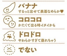 おつうじを「バナナ」「コロコロ」「ドロドロ」「でない」のシンプルな4種類のマークで表現。その日のおつうじに近いマークに印をつけるだけ!簡単に記録できるので、続けることも苦になりません。