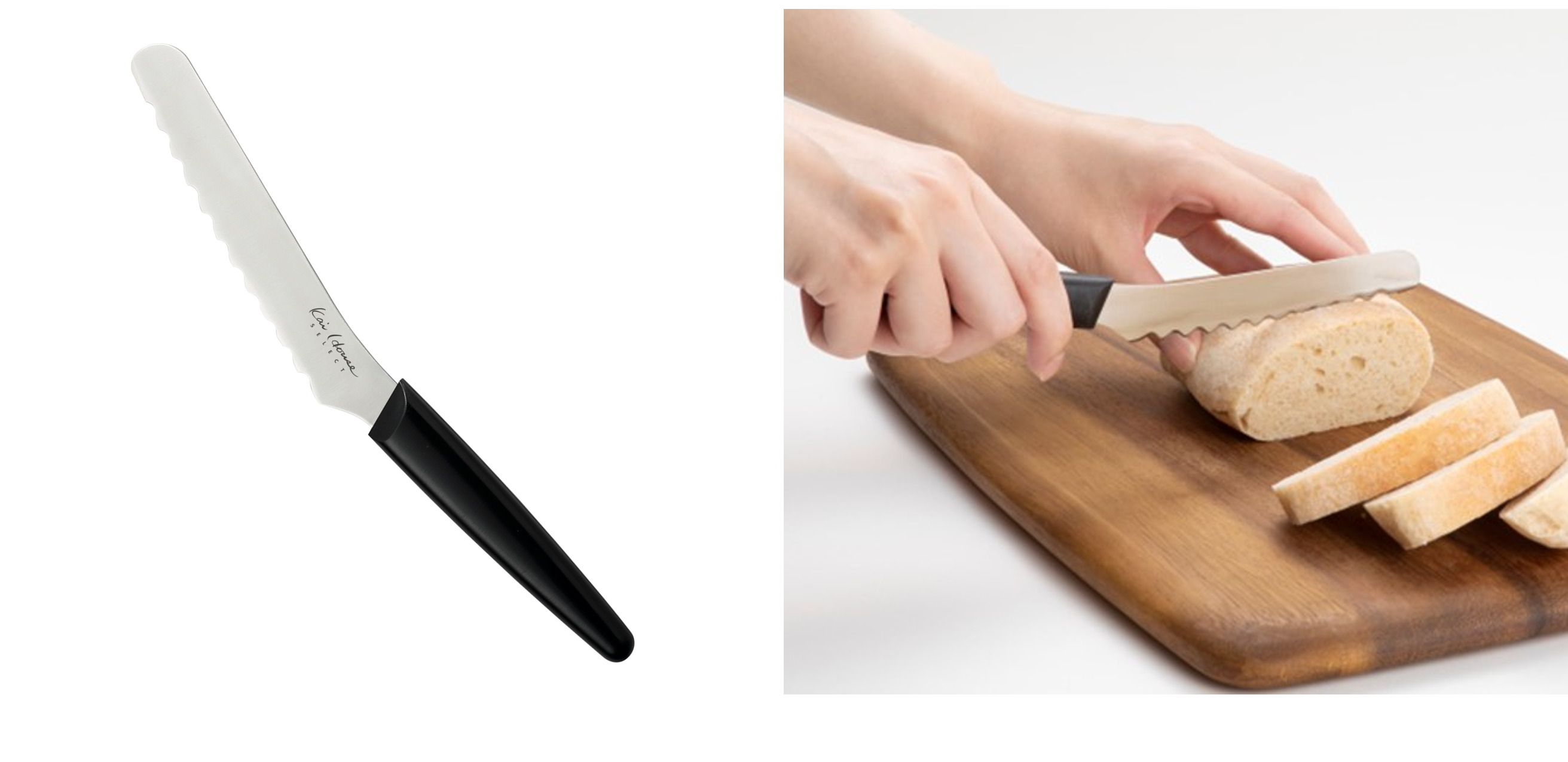価格:1,300円(税抜) / 1,430円(税込)刃渡り11cmと、コンパクトで卓上使いにぴったりなブレッドナイフ。アップハンドルで手がまな板に当たりにくく、パンの切り分けに便利な波刃です。