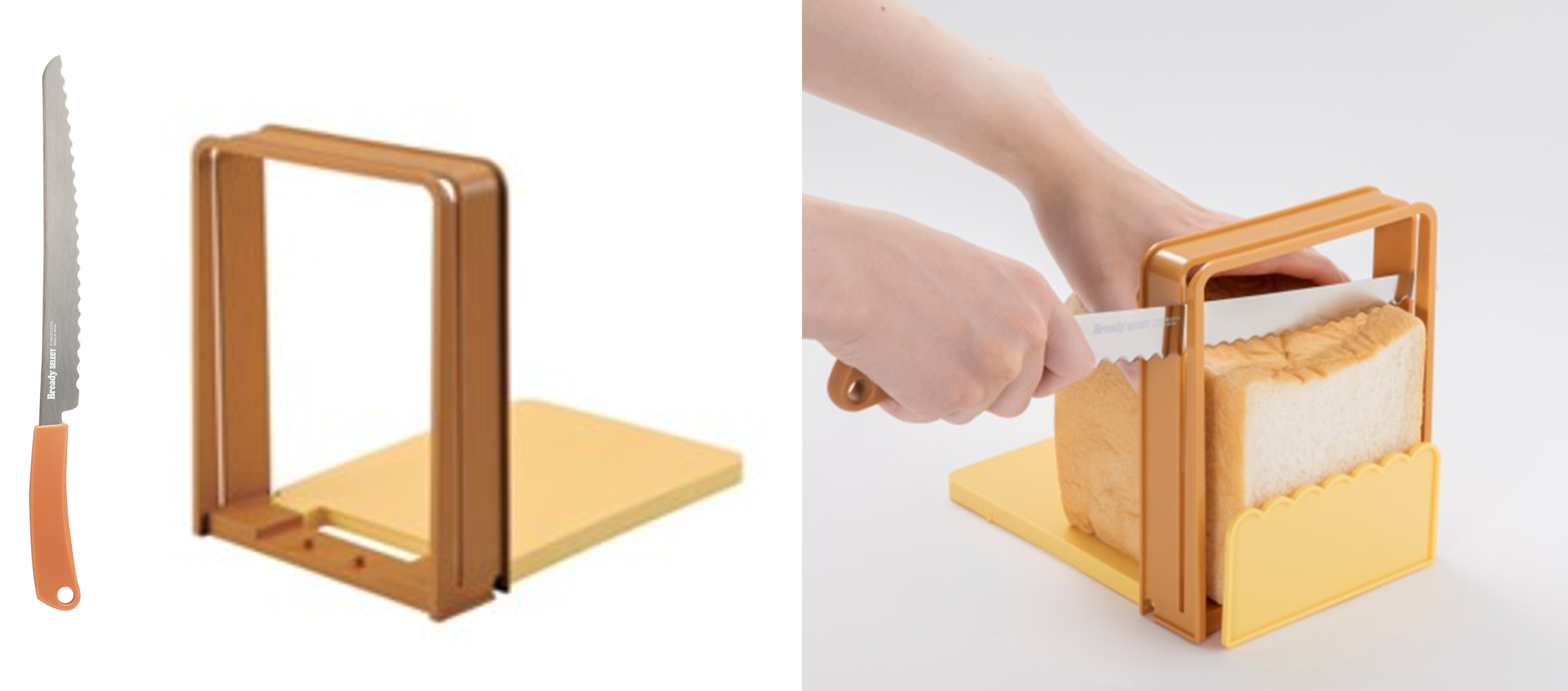 パン切りナイフと、5段階から好みの厚さに簡単にカットできるパン切りガイドのセット。ガイドはすべり止め付きで使いやすく、折りたたんでコンパクトに収納することができます。