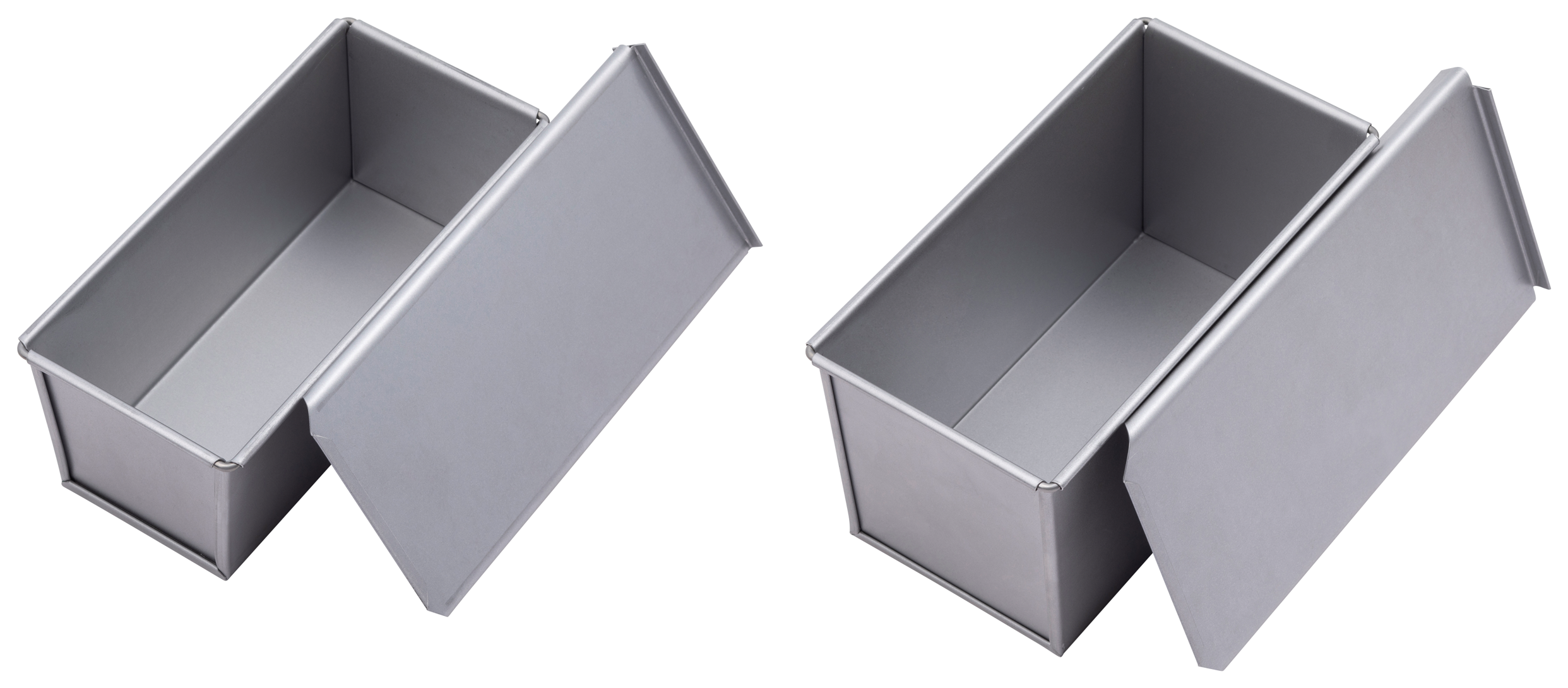 熱回りがよくふっくらおいしく焼ける食パン型。1斤では約9×21×8.5cm、 1.5斤では11×21.5×12cmの食パンを焼くことができ、蓋を外して焼くと山形食パンを作ることも可能です。