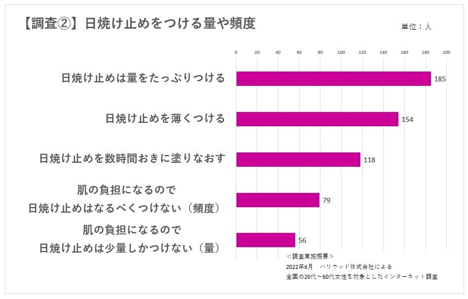 日焼け止めをつける量や頻度については、「量をたっぷりつける」という人が最多で185人、対し、「薄くつける」という人も154人いました。「肌の負担になるので日焼け止めはなるべくつけない(頻度)」(79人)、「肌の負担になるので少量しかつけない」(56人)と、肌への負担を意識して日焼け止めを避ける人もいるようです。(【調査②】)