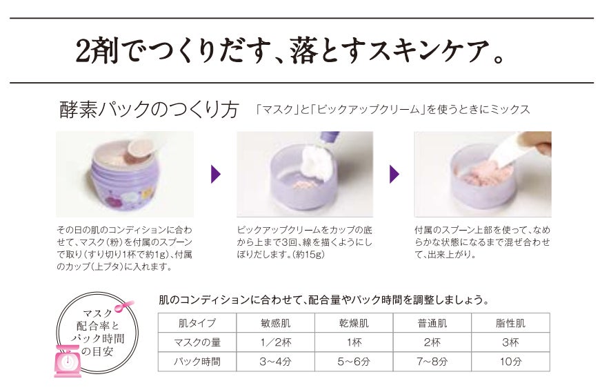 酵素配合のパウダー状パックです。カップになるフタと正確に計量できる専用スパチュラ付。