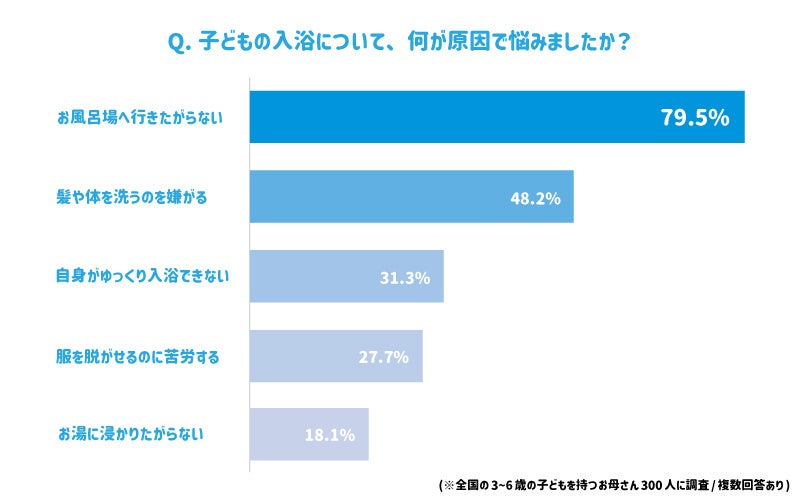 子どものお風呂嫌いでお困りのお母さんたちの79.5%が、「子どもがお風呂場へ行きたがらない」ことに悩んでいます。(※全国の3~6歳の子どもを持つお母さん300人に調査)