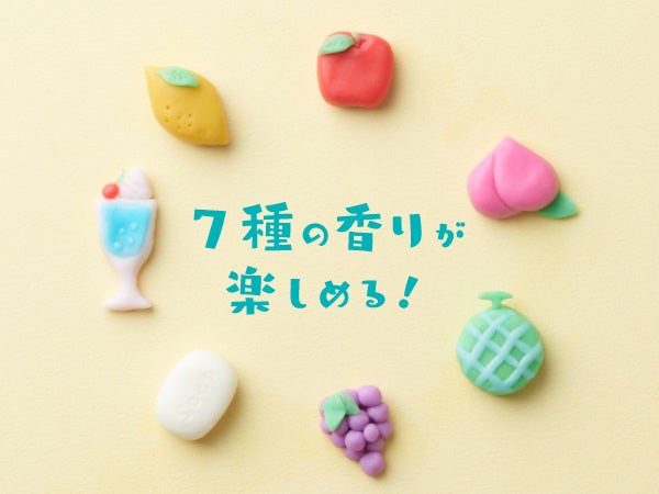 それぞれ違った香りが楽しめる、全7色のあわぶろねんど。(もも・メロン・レモン・ソーダ・りんご・ぶどう・せっけんの香り)