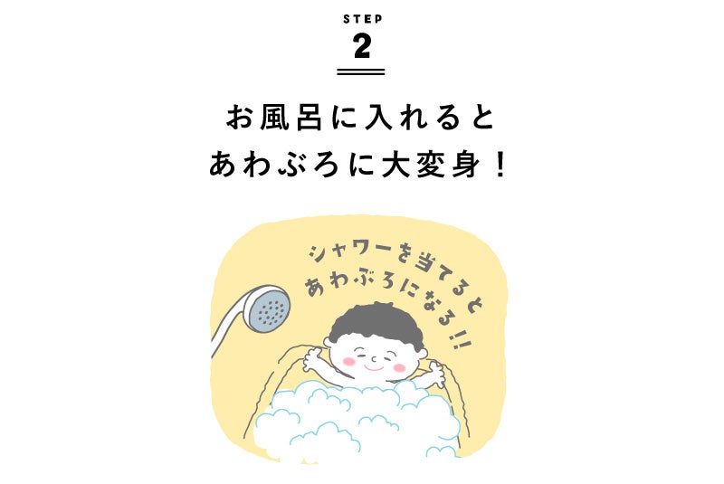 『あわぶろねんど』は、お部屋でのねんど遊びの延長に“おふろタイム”があるので、お風呂嫌いの子どもも思わずお風呂場へ行きたくなってしまいます。お風呂場では、ねんどがモコモコと泡立つ“泡風呂”に大変身!