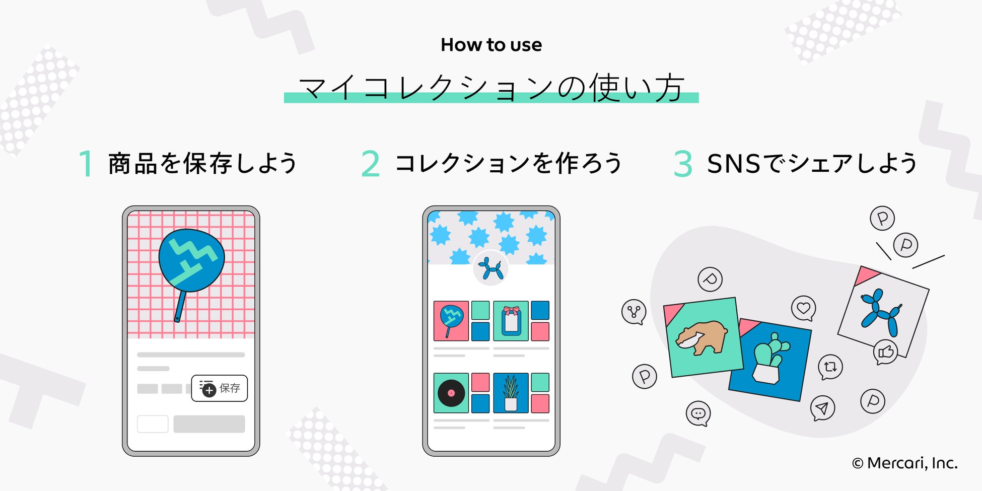 「マイコレクション」は、「メルカリ」で見つけた商品を、自分の好きなテーマごとに集めてコレクションを作成し、普段お使いのSNSでシェアできる機能です。