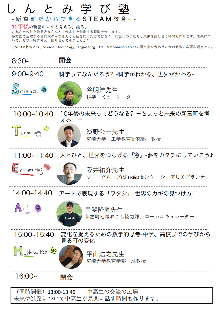 「世界一チャレンジしやすいまち」を掲げる宮崎県新富町だからこそ出来る教育として、各方面で活躍する5人の専門家を迎えて教育フォーラムを開催。STEAM(Science、Technology、Engineering、Art、Mathematicsの5つの頭文字を合わせた今の教育に必要な観点)教育の入り口として、各分野の有識者と町の中学高校生が意見を交わしながら未来を想像する1日になります。