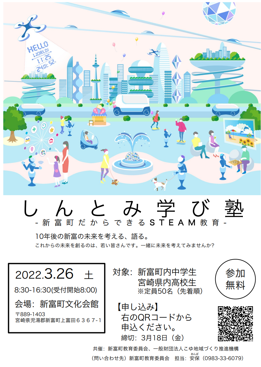 新富町教育員会は、一般財団法人こゆ地域づくり推進機構(宮崎県児湯郡新富町、代表理事:齋藤潤一、以下こゆ財団という)と連携し、「しんとみ学び塾」と題して10年後の新富の未来を考え、語り合う教育フォーラムを実施することをお知らせいたします。