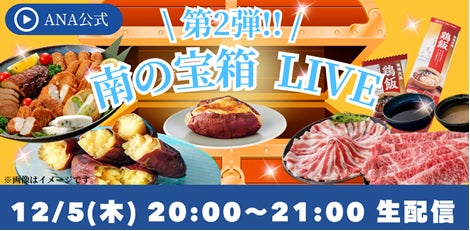 ANA X株式会社(代表取締役社長:神田 真也、本社:東京都中央区、以下「ANA X」)は、2024年12月5日(木)20時より、ANAのライブコマースサービス「ANA LIVE SHOPPING」にて「第2弾!南の宝箱 鹿児島LIVE ~鹿児島の特産品を大放出!~」を配信します。
