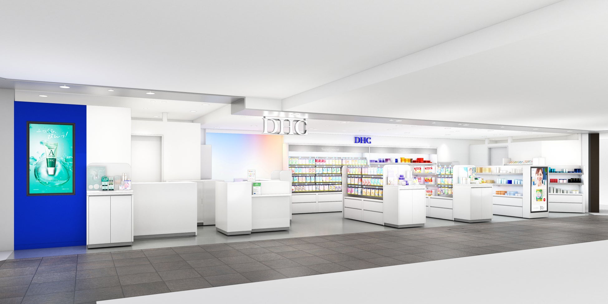 Osaka Metro・JR・阪神・阪急が集中する巨大ターミナル「大阪駅」「梅田駅」付近に広がる地下街「ホワイティうめだ」内に位置する「DHCホワイティうめだ直営店」は、日ごろから多くのお客様にご利用いただいております。この度、地下道(コンコース)のリニューアルに併せて、第二創業期を迎えたDHCが今年5月に刷新した新コーポレートロゴが際立つ白を基調とした店内に、鮮やかなグラフィックエレメントを施した装いでリニューアルいたします。多数の商品からお客様のお悩みに沿った商品をご提案し、日本国内外のお客様へ健やかに美しく生きる毎日を提供いたします。