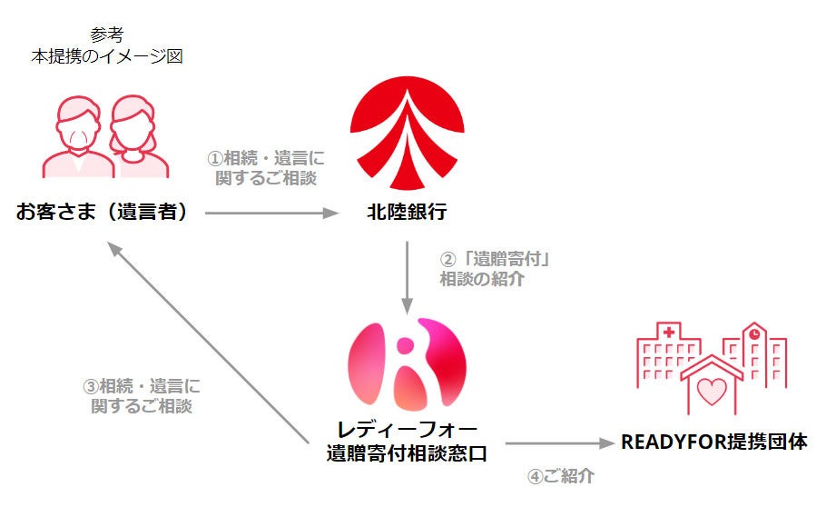 本提携では、北陸銀行が遺贈寄付を検討されているお客さまのご希望に応じて「レディーフォー 遺贈寄付サポート窓口」を紹介し、当窓口では、寄付先候補としてNPO等のご提案・マッチングを行います。一般社団法人READYFOR財団を活用した不動産や有価証券での寄付にも柔軟に対応できる体制が築けることで、より多くのお客さまのニーズに対応できることが期待されます。