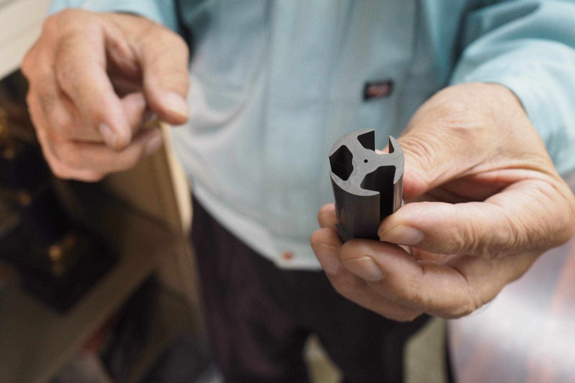 「有限会社三恵技研」はダイヤモンドホイール以外では加工できない超硬部品(金属で一番硬い材質)の加工を得意としており、スチール製よりも耐久性に優れた金型パーツを製作しています。こちらで製作された金型の部品パーツは、最終的にはトースターや電気釜などの白物家電の製造に使用されています。