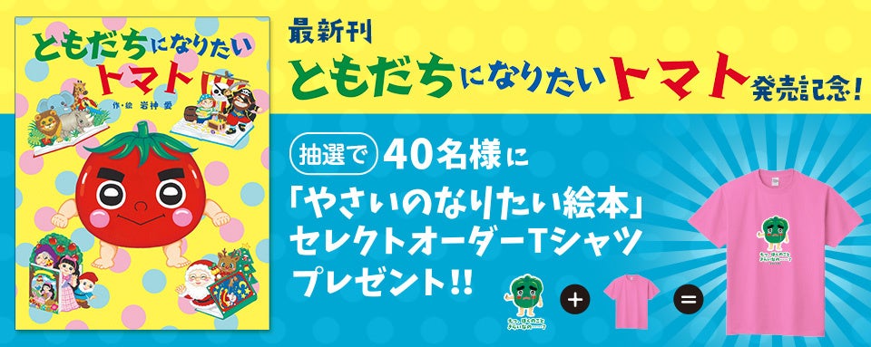 『ともだちになりたい トマト』の発売を記念して、「やさいのなりたい絵本」シリーズキャンペーンが1/16より開始!「やさいのなりたい絵本」シリーズの、えらべるTシャツを40名様にプレゼントします! 詳細は絵本についている帯をご覧ください。