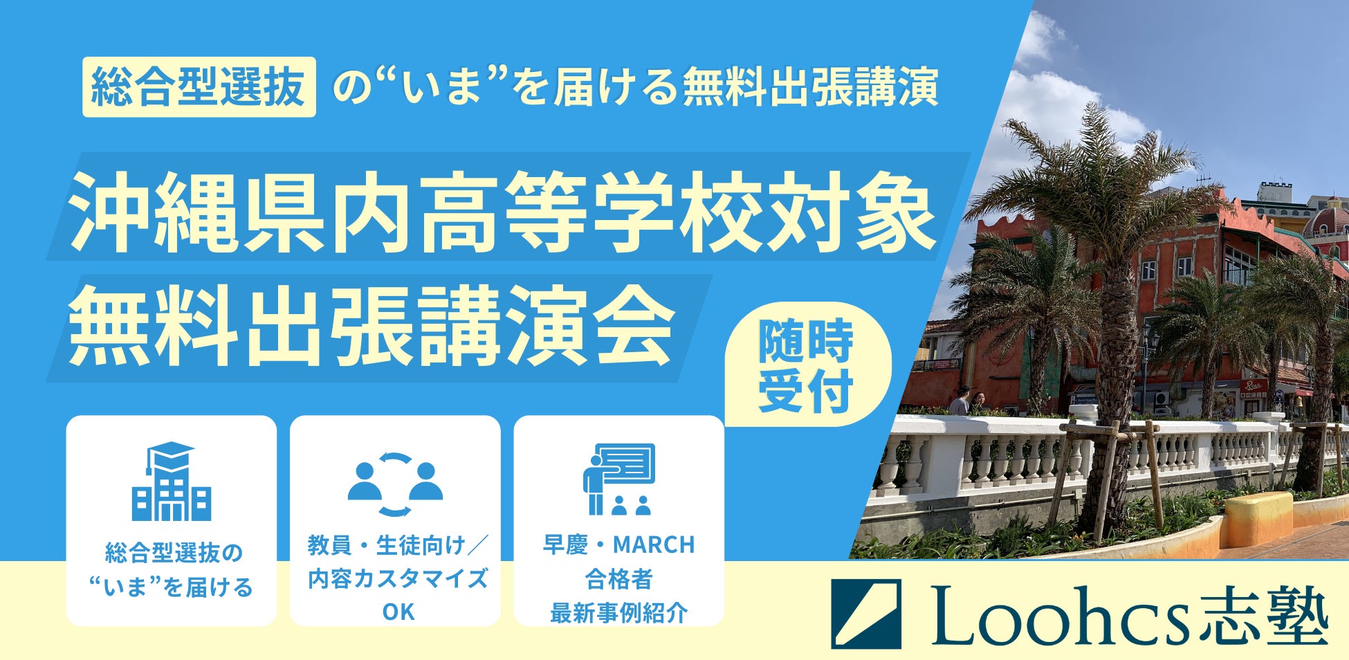 そうした課題を受けて、総合型選抜専門塾ルークス志塾(全国32校舎・累計合格者数7,000名以上)は、沖縄県内の高校を対象に無料での出張講演を実施することを決定しました。
