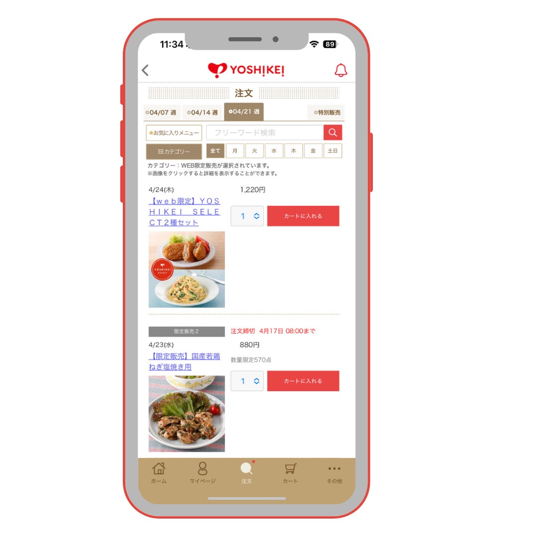 アプリ(またはWEB注文ページ)の「カテゴリー」から「WEB限定販売」をタップして販売中の商品をチェックしてください。