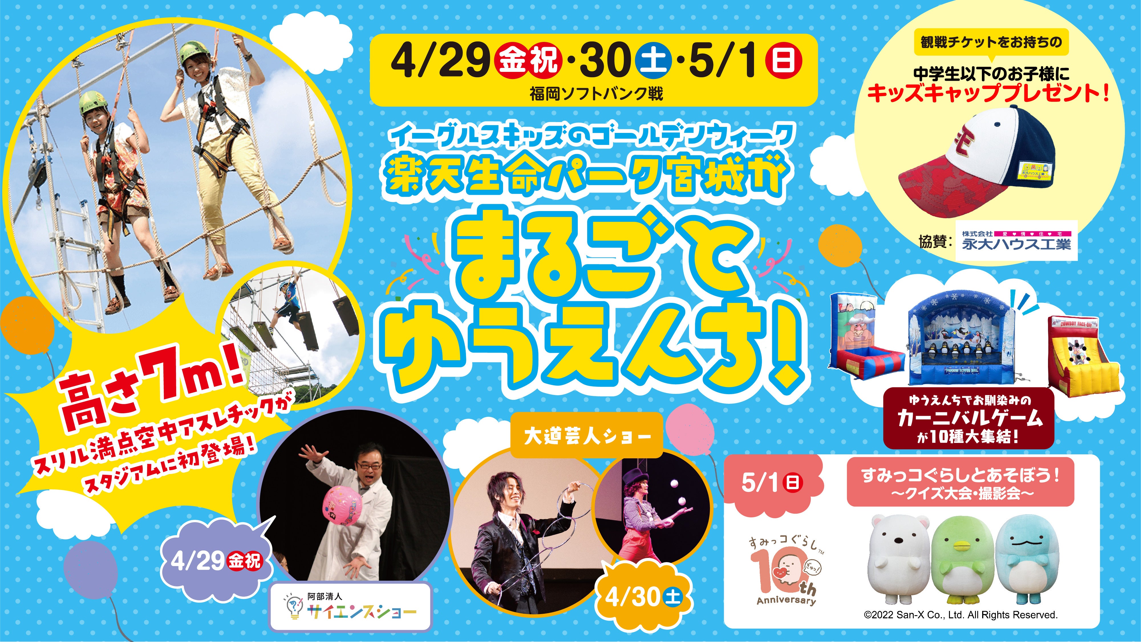 株式会社楽天野球団(本社:宮城県仙台市宮城野区、代表取締役社長:米田 陽介)は、4月29日(金・祝)~5月1日(日)福岡ソフトバンクホークス戦において、楽天生命パーク宮城全体が遊園地のように楽しめるイーグルスキッズのゴールデンウィークを実施することとなりましたので、お知らせいたします。