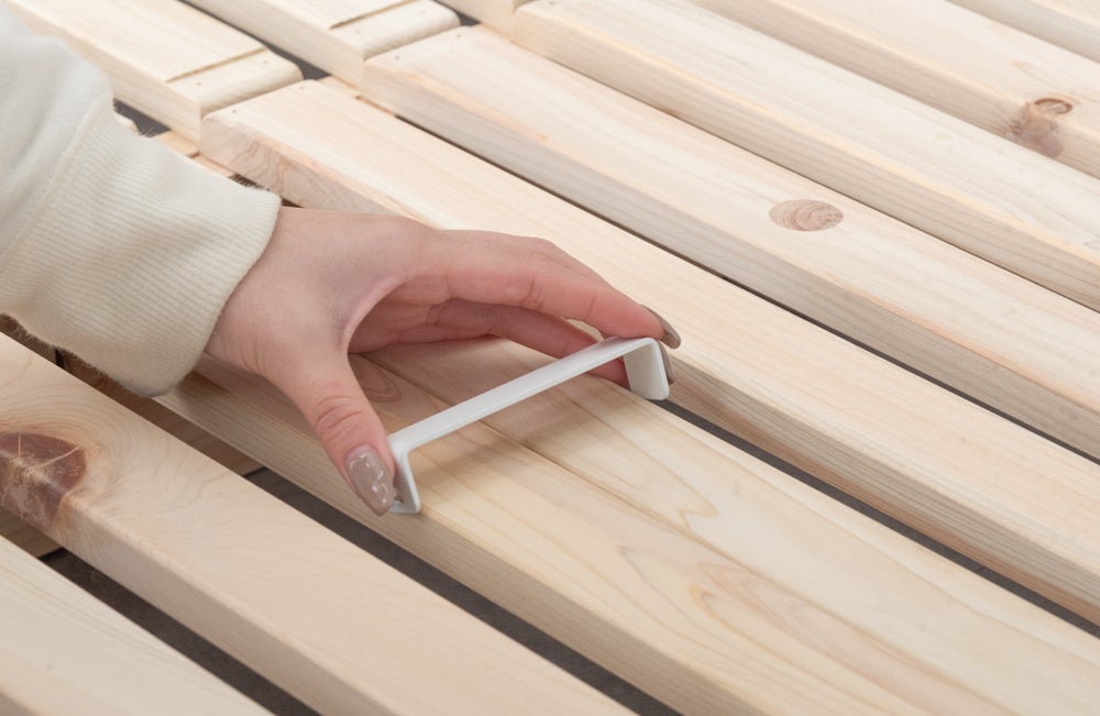 美しい木目と爽やかな香りが特徴の愛媛県産ひのき材を使用し、材料の仕入れから国内で行っています。ひのきにはリラックス効果のある香りのほか、カビの発生を抑える調湿性、防虫効果、高い耐久性など、快適で安心な睡眠環境をサポートする特長があるため、より長くお使いいただけます。