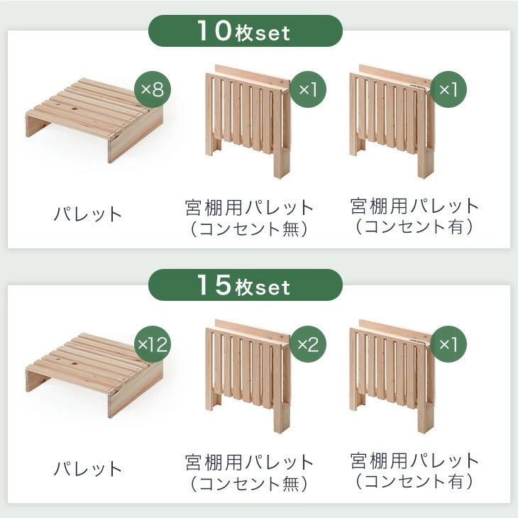本シリーズは、宮棚付きの10枚・15枚・20枚セットに加え、通常パレットのみのセットや連結パーツ単体でもご購入いただけます。マットレスのサイズやお部屋の広さに応じて必要枚数を追加することで、さまざまなレイアウトをお楽しみいただけます。