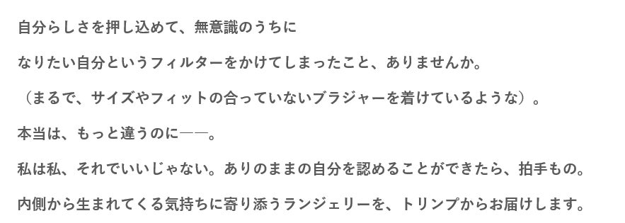 心のままに動くボディにフィットしてコンフォートさを叶える、軽く、サステナブルな、トリンプの新しい提案です 。
