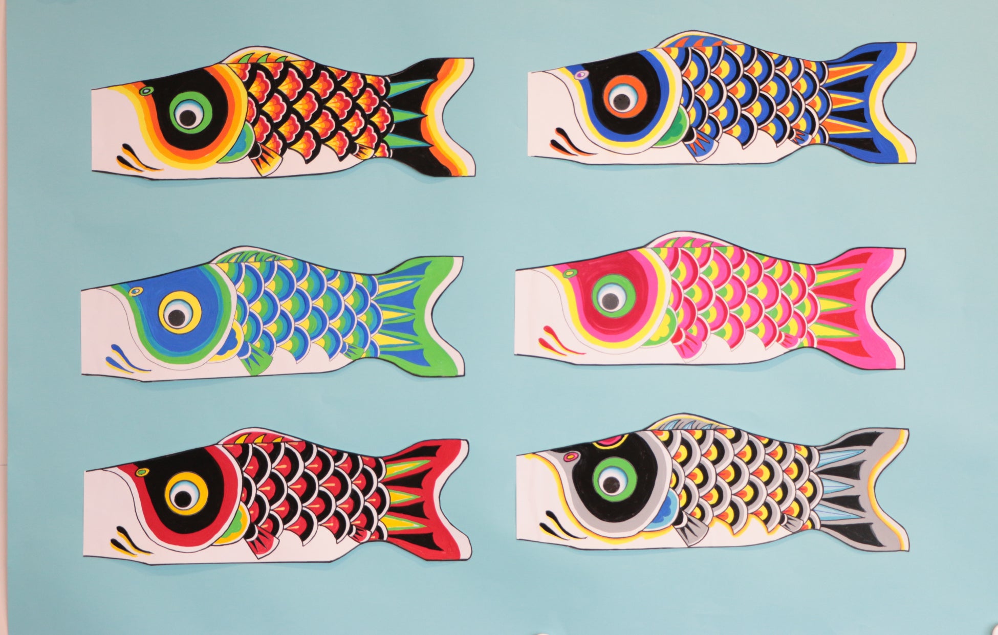空き容器や紙コップ、使用済みの切手やマスキングテープを使って、こいのぼりを作ります。