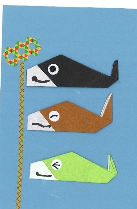 さらに、折り紙でこいのぼりを折り、カードに貼り付けて、スタンプやマスキングテープでデコレーションしたこいのぼりカードも作ります。