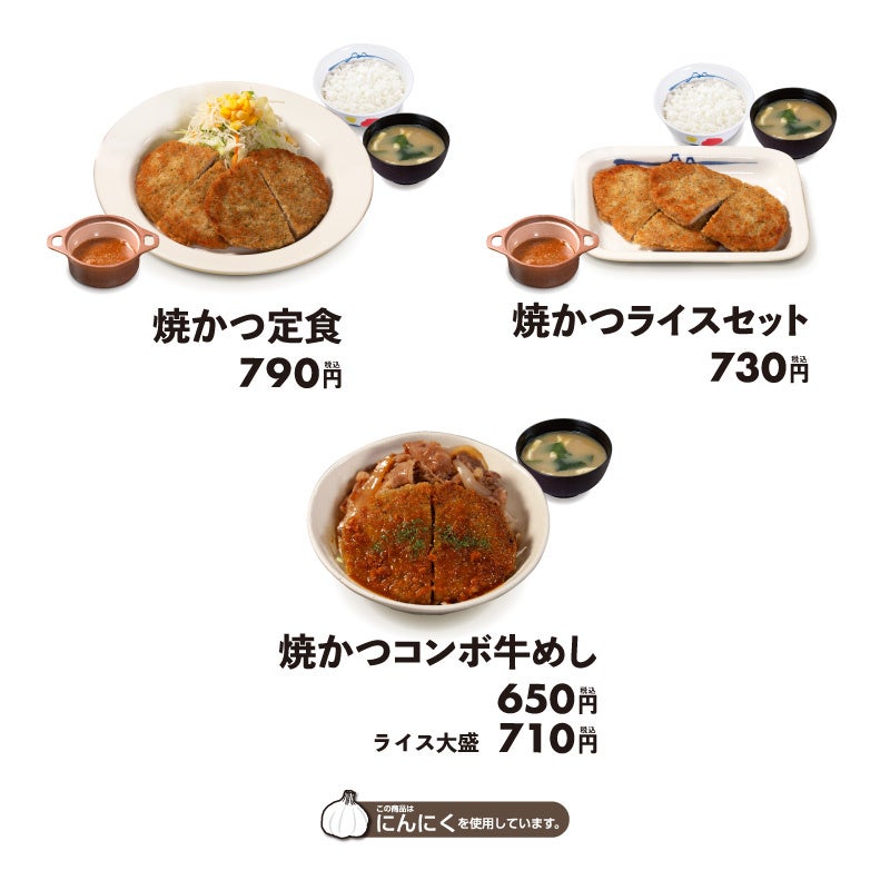 | 商品名 焼きかつ定食 790円 焼きかつライスセット 730円 焼きかつコンボ牛めし 650円(ライス大盛)710円 ※お持ち帰りいただけます。お持ち帰りにみそ汁は付きません。 お持ち帰りの場合、みそ汁は別途60円でお求めいただけます。 ※全て税込み価格です。また、店内・お持ち帰りの税込価格は同一です。 発売日 2022年6月7日(火)午前10時 ~ ※新発売を記念して「焼きかつコンボ牛めし」をご注文のお客様を対象に、2022年6月14日(火)10時まで、ライス大盛を無料サービスします。 ※定食・ライスセットのライスは、全サイズ、ワンプライスでご提供しております。 対象店舗 一部店舗を除く全国の松屋 |