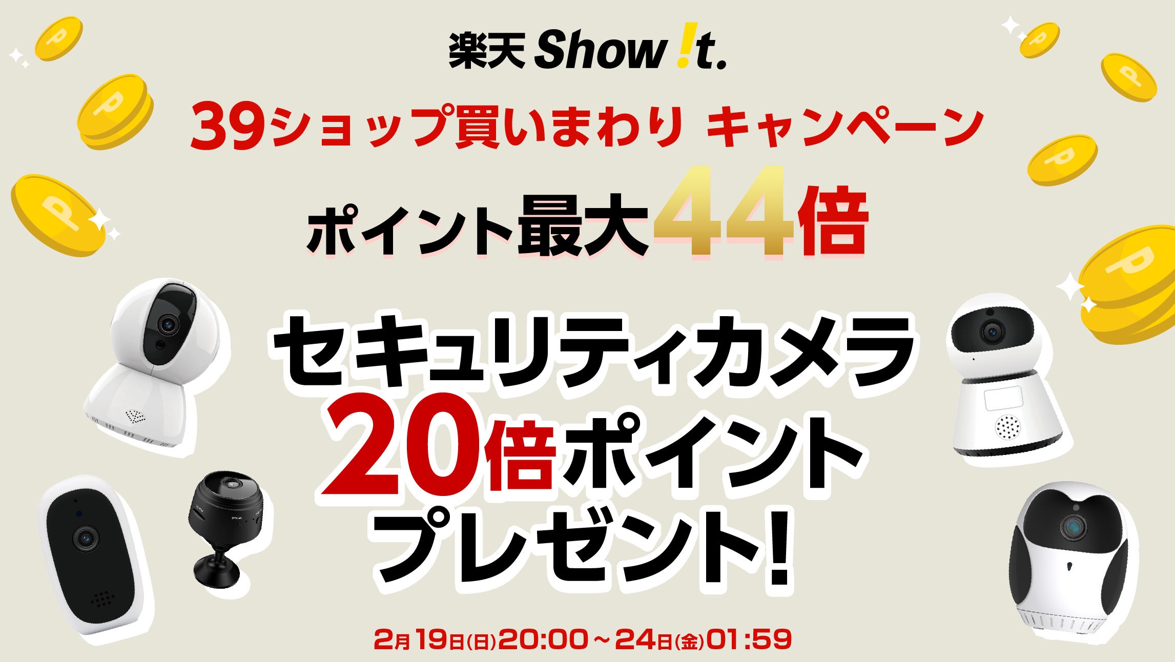 楽天市場「Show !t」は、2月19日(日)20時~2月24日(金)01時59分まで開催される楽天39ショップ買いまわりに参加し、セキュリティカメラ5種類からお買い上げの方に、ポイントを20倍プレゼントします。