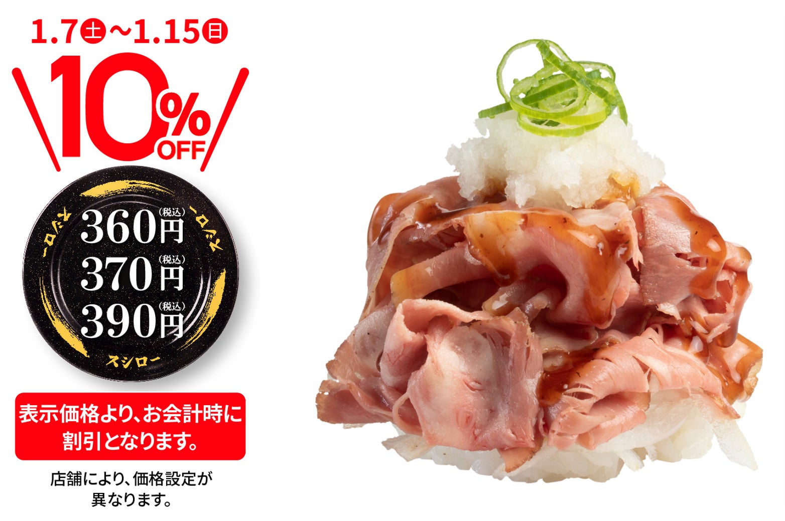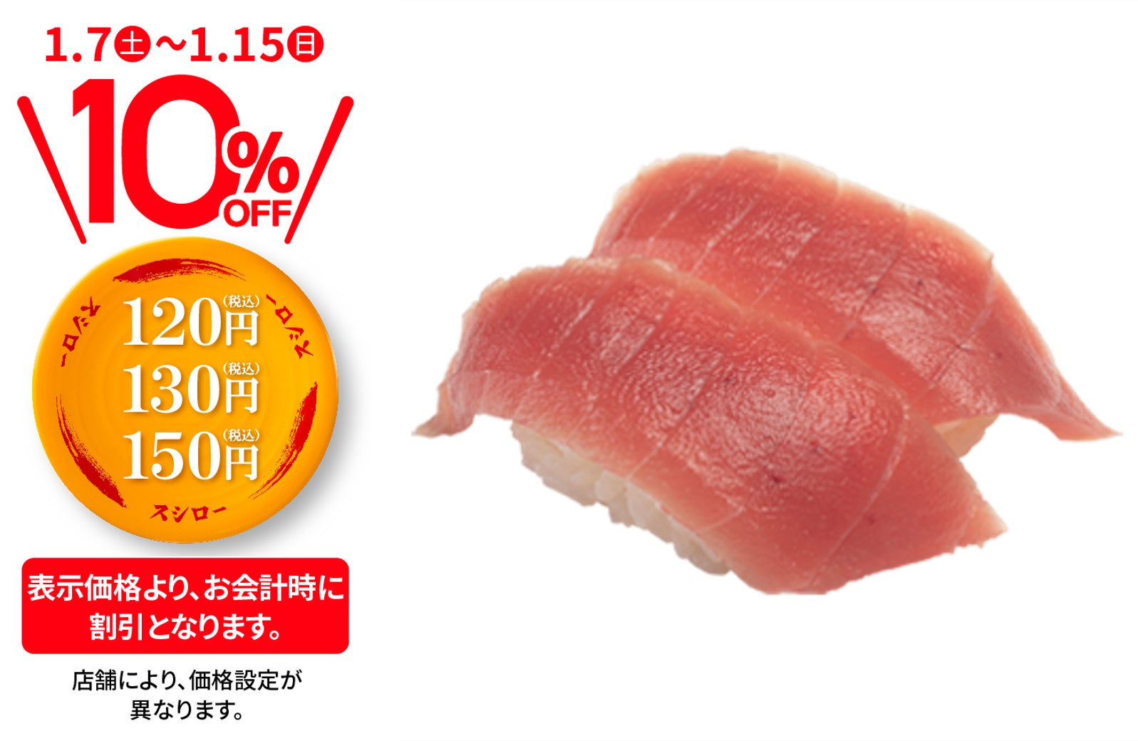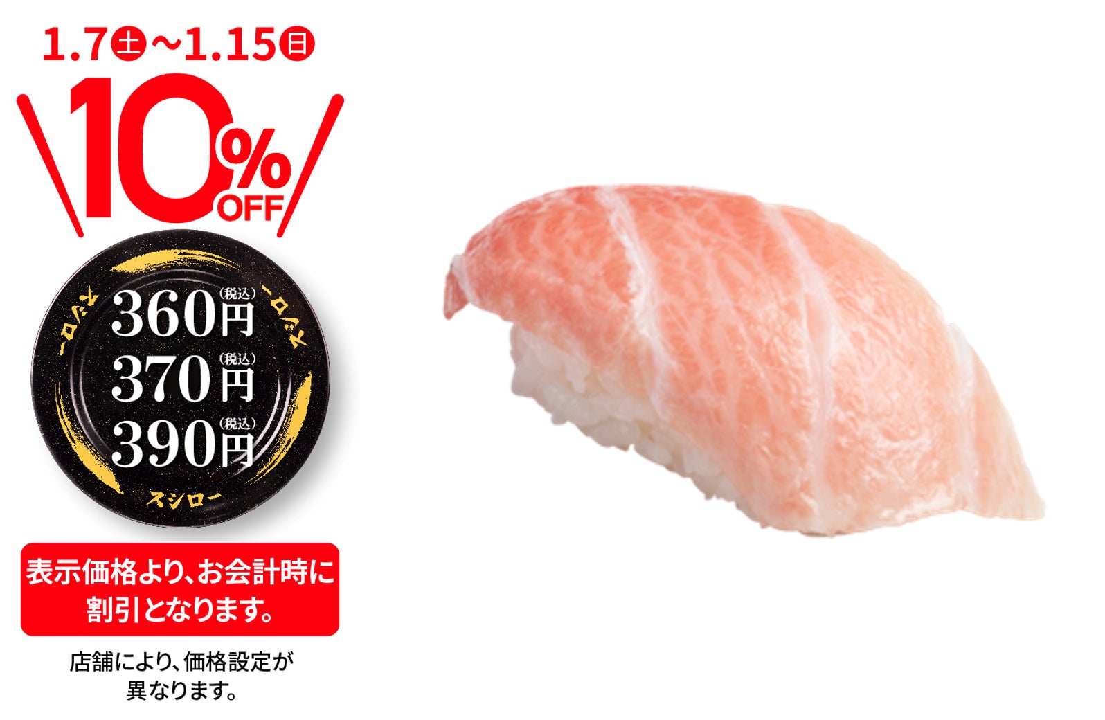 株式会社あきんどスシロー(本社:大阪府吹田市、代表取締役社長:新居 耕平)は、1月7日(土)より、店内飲食限定でおすし全商品が税込価格より10%OFFとなる『おすしぜ~んぶ10%OFF』(※1)を行います。新しい年の始まりに合わせてお客さまへの感謝の気持ちを込めた大還元フェアです。