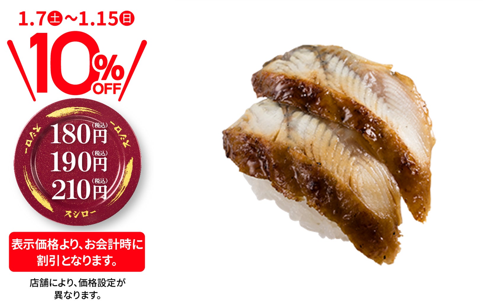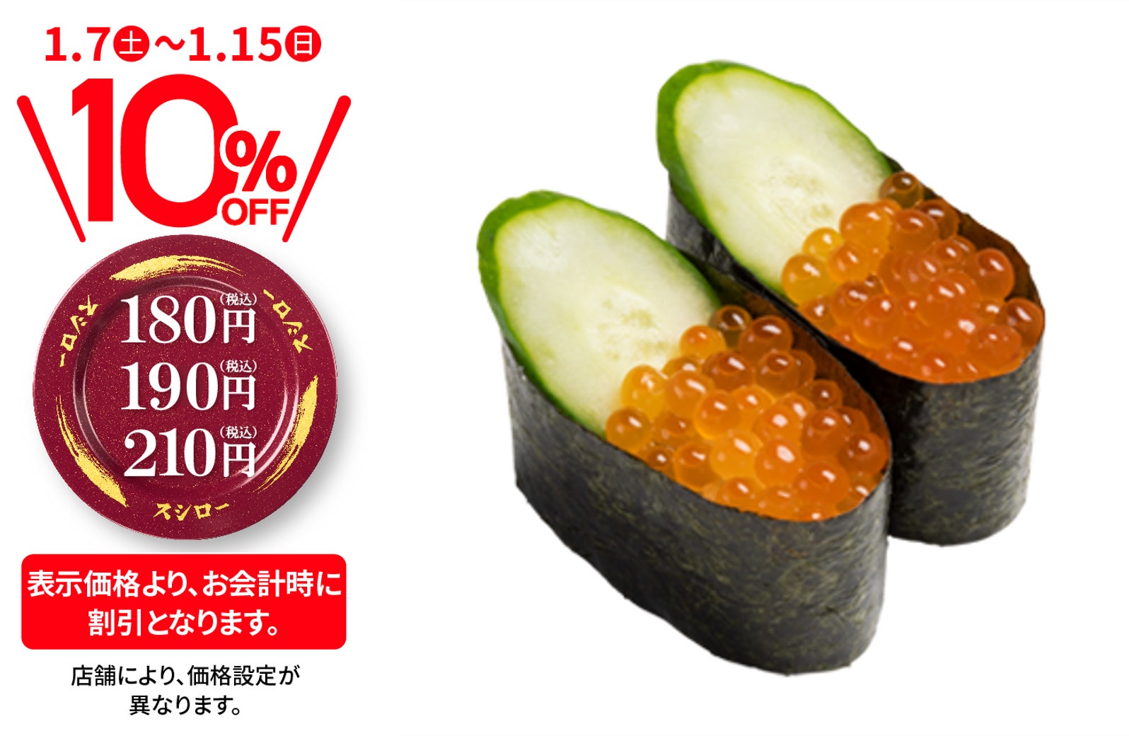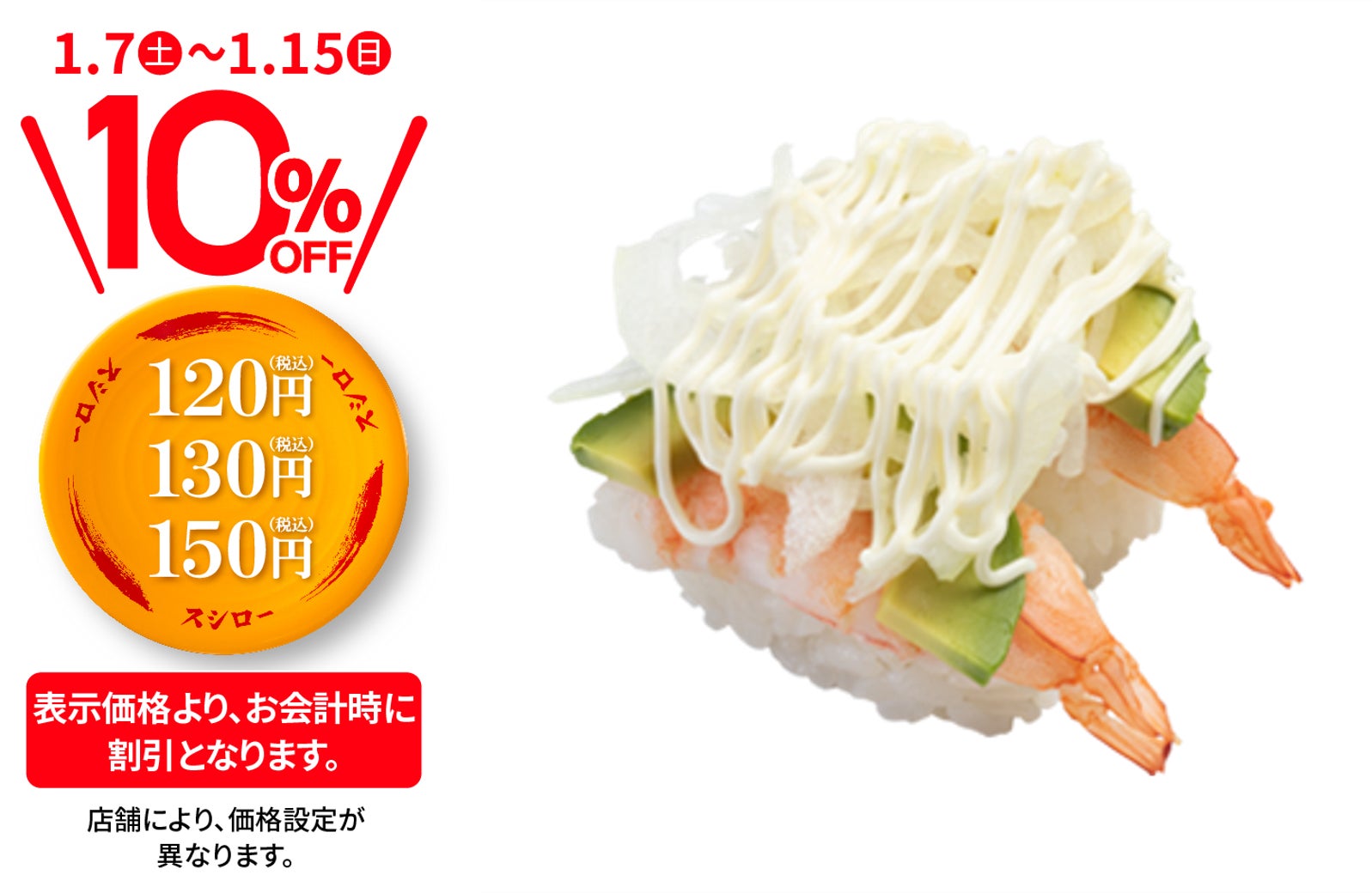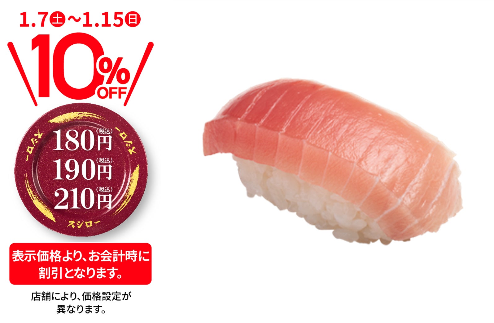 株式会社あきんどスシロー(本社:大阪府吹田市、代表取締役社長:新居 耕平)は、1月7日(土)より、店内飲食限定でおすし全商品が税込価格より10%OFFとなる『おすしぜ~んぶ10%OFF』(※1)を行います。新しい年の始まりに合わせてお客さまへの感謝の気持ちを込めた大還元フェアです。