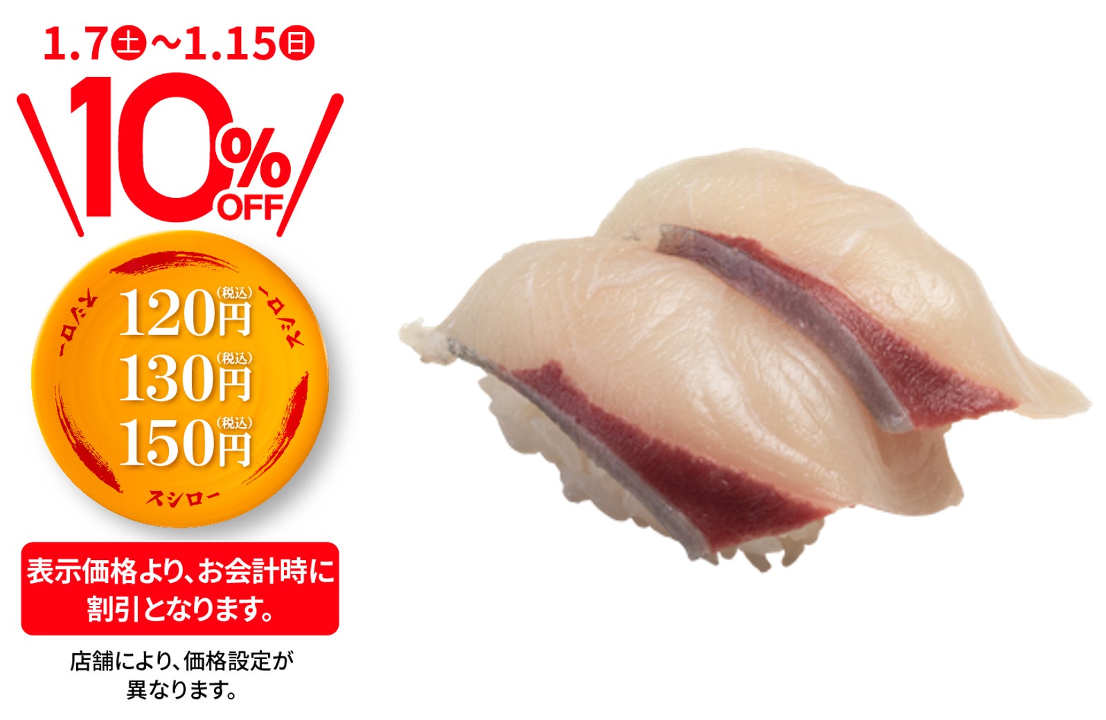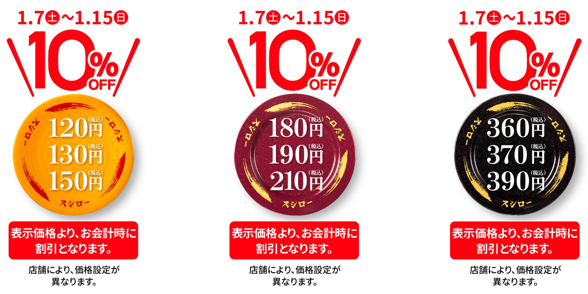 今年初、最大級の大還元!店内飲食限定!感謝の気持ちを込めて『おすしぜ~んぶ10%OFF』!黄、赤、黒、中皿など、すべてのおすしが“10%OFF”でお得に!