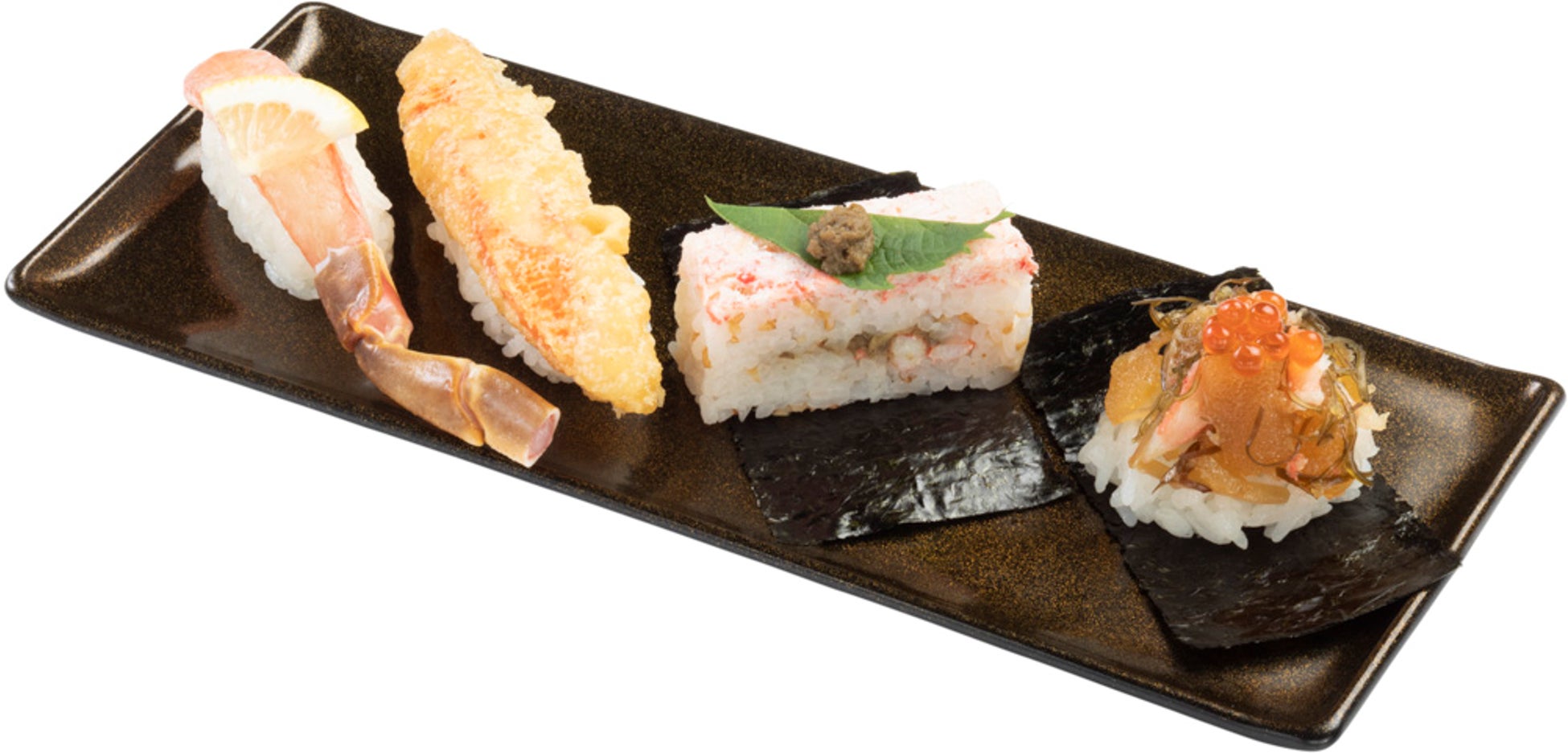 左から、とろっとした食感と甘みが楽しめる“生”の本ずわい蟹。店内で揚げることでかにの旨みをしっかりと味わえる本ずわい蟹の“天ぷら”。紅ずわい蟹の旨味とかに味噌ならではのコクを一緒に味わえるかにの“押し寿司かに味噌のせ”。スシローオリジナルの松前漬けに紅ずわい蟹を合わせた“松前”。“松前”には、さらに贅沢にいくらをトッピングしました。スシローこだわりの店内調理で、ひと手間もふた手間も加えた豪華な食べ比べできる一皿をぜひご賞味ください。