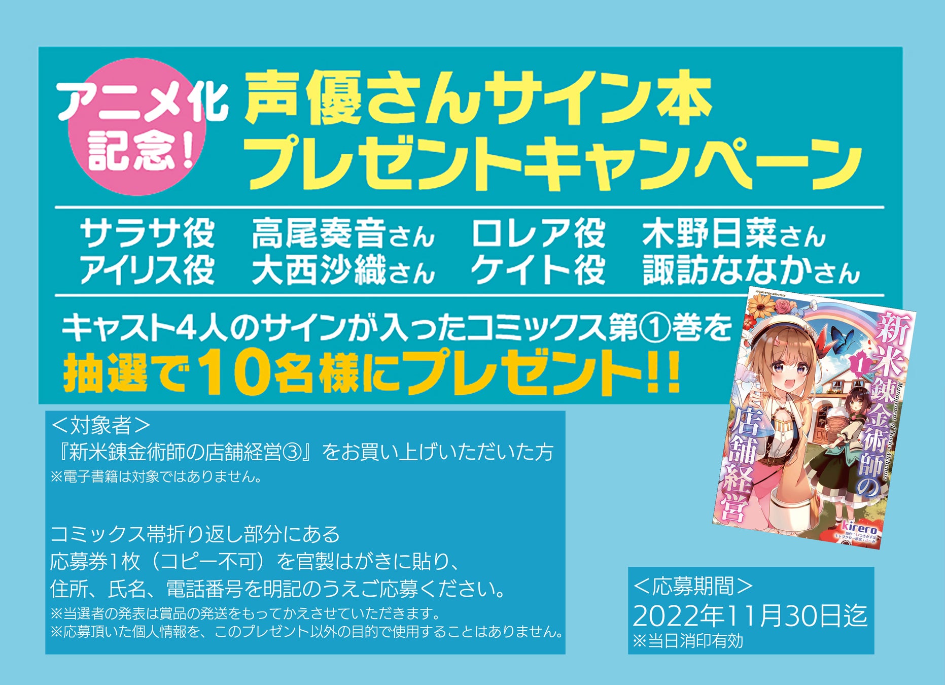 TVアニメ絶賛放送中!『新米錬金術師の店舗経営』待望の最新第3巻発売!アニメ化を記念して高尾奏音、木野日菜、大西沙織、諏訪ななか、キャスト4名のサインが入ったコミックスプレゼントキャンペーンも開催!