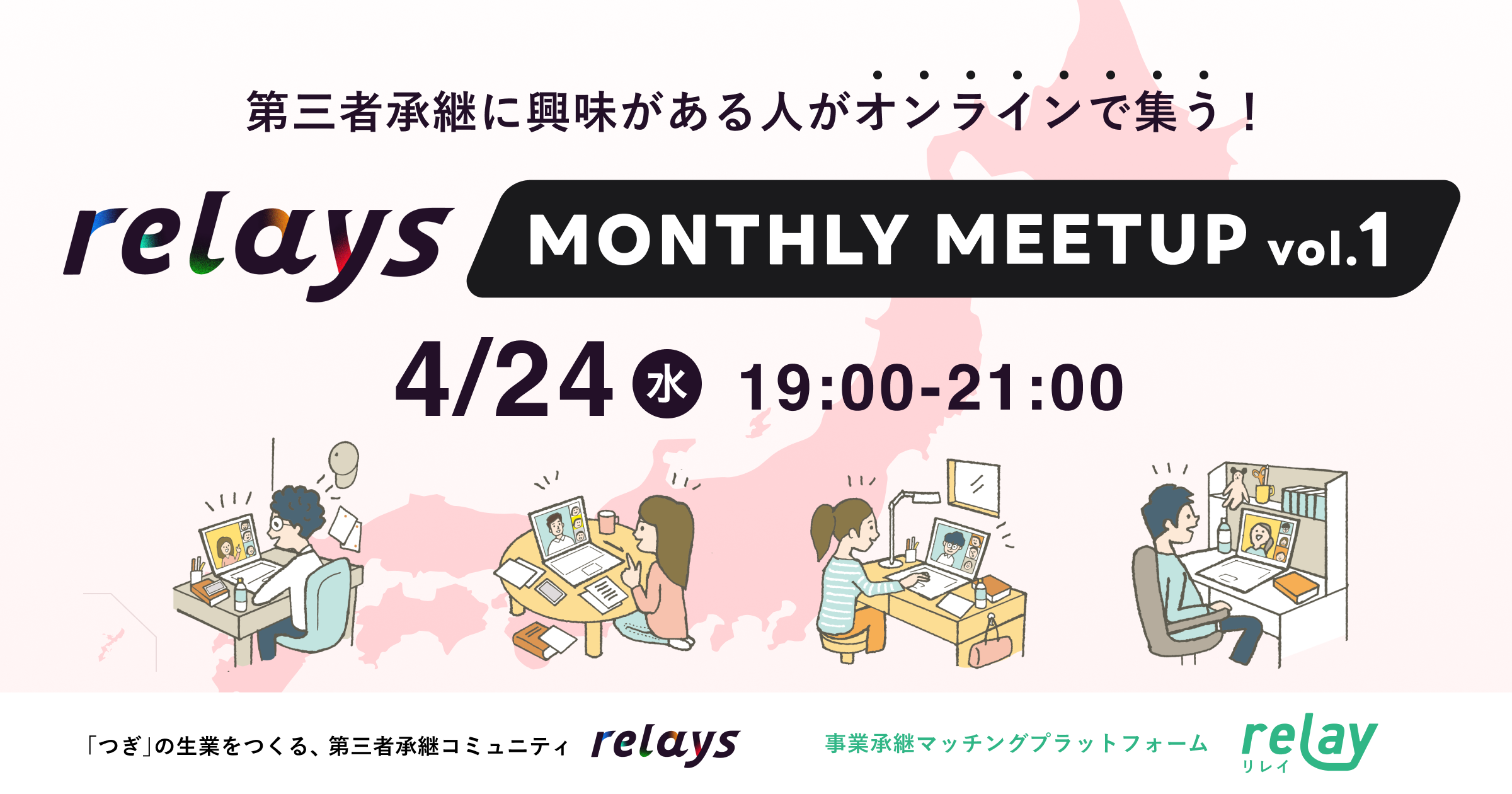 【オンライン交流会】第三者承継コミュニティ「relays(リレイズ)」、事業承継について気軽に話せる定期イベント「relays MONTHLY MEETUP」スタート!第一弾は4月24日(水)開催。