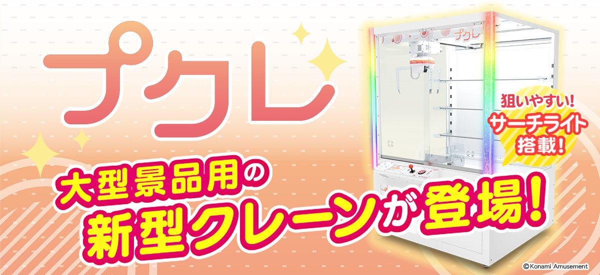 株式会社コナミアミューズメントは、全国のアミューズメント施設にて大型アミューズメント景品用の新型クレーンゲーム機『プクレ』が順次稼働を開始することをお知らせします。