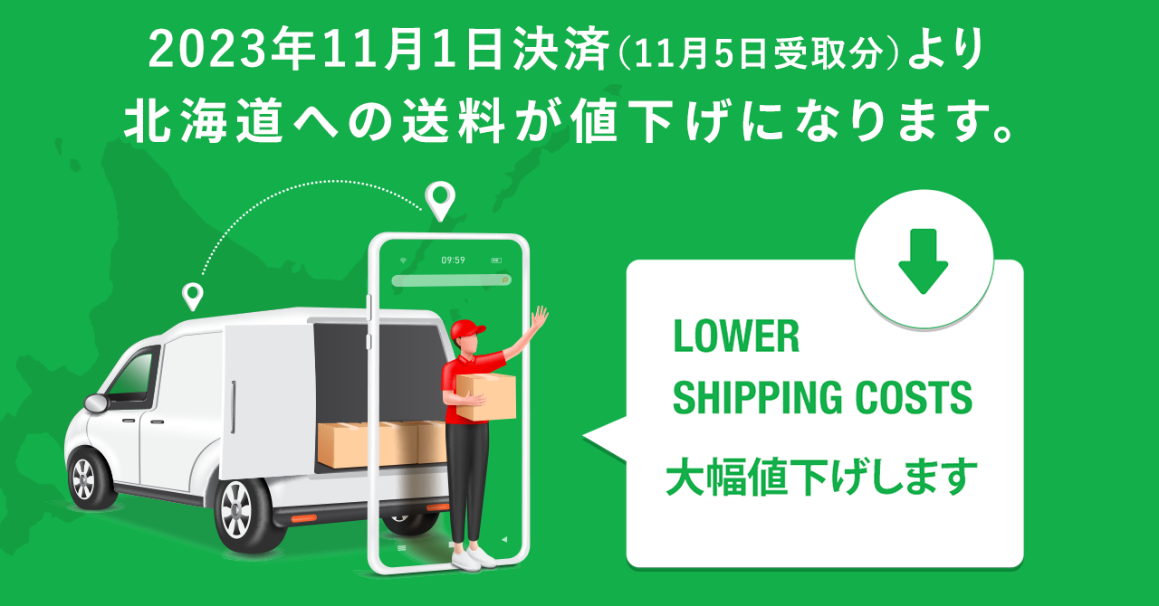 北海道地域への送料につきましては、2023年11月1日(水)決済確定分(11月5日(日)受取分)より以下の通り変更となりました。