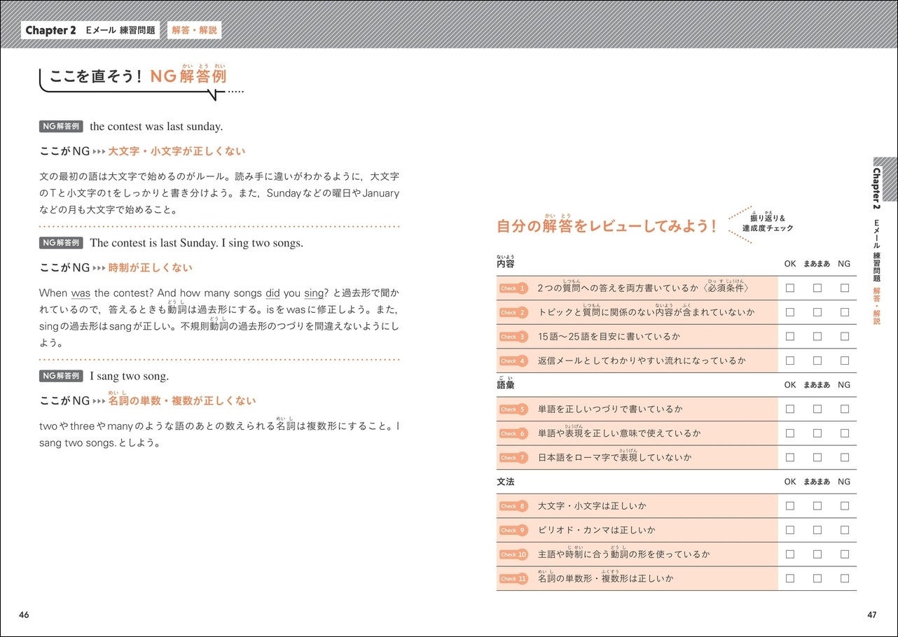 本番形式の問題に取り組みながら書き方を学べます。模範解答はもちろん、練習問題ではNG解答例もついているので、つまずきやすいポイントや誤った表現を克服できます。