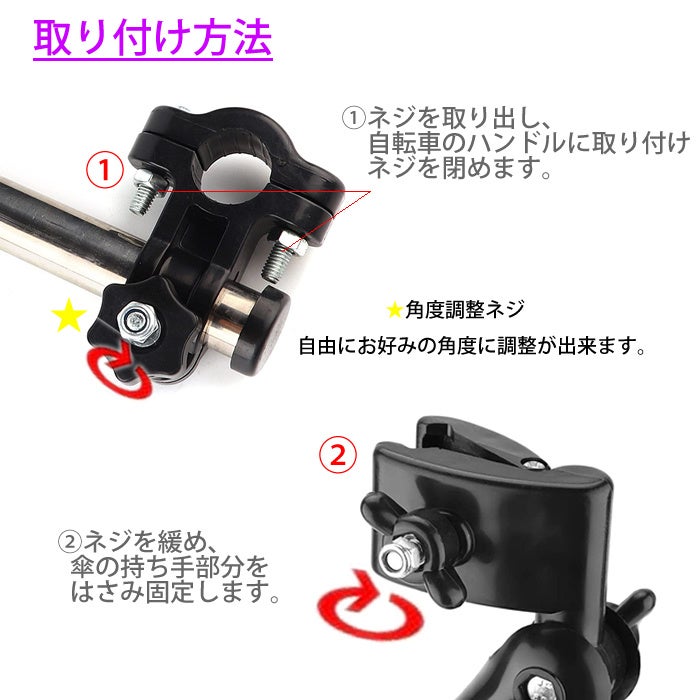 ・ハンドル取り付け部分のネジ(10mm)を付属のレンチ(スパナ)で取り外し、自転車のハンドルに取り付けてネジを締めます。あとは、上部の傘固定部のネジをゆるめ、傘の柄や支柱をはさむだけ。