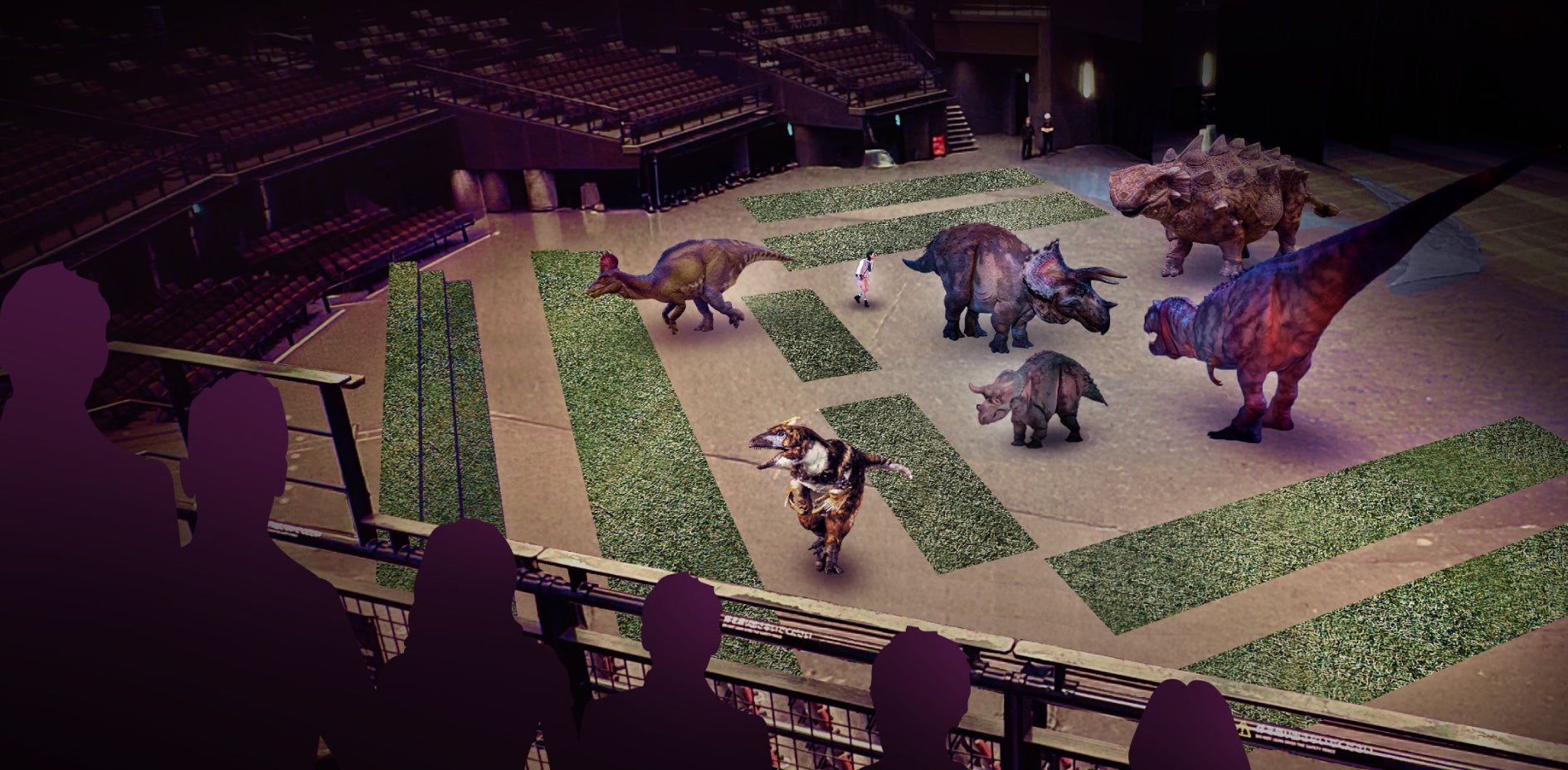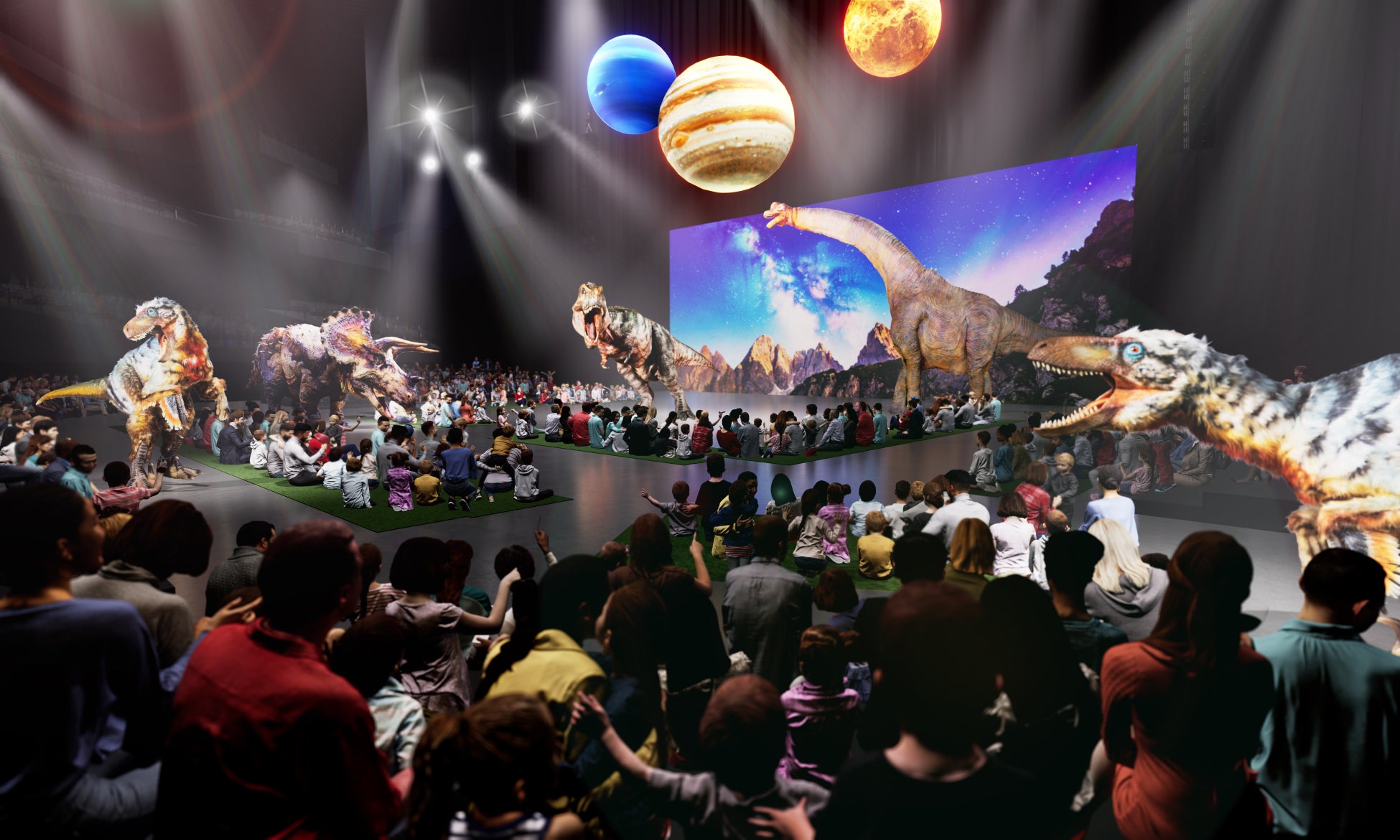 キービジュアルに続き、本作の世界観を立体的に表現したイメージパースをこのたび初公開いたします。太古の地球で繰り広げられるドラマチックな恐竜たちの営みを、東京ガーデンシアターならではの開放的で立体的な空間で没入体験していただけます。