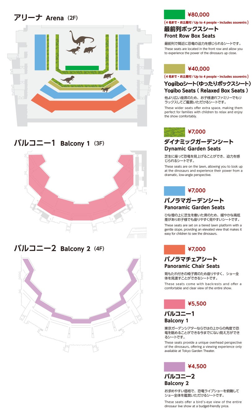 奥行きのある会場全体をゆったりと見渡せるこの席は、ステージに近すぎないため、小さなお子さまでも安心して観覧できます。背もたれ付きの椅子でリラックスしながら、地上とは異なる「恐竜を上から見下ろす」という、東京ガーデンシアターならではの体験をご堪能ください。
