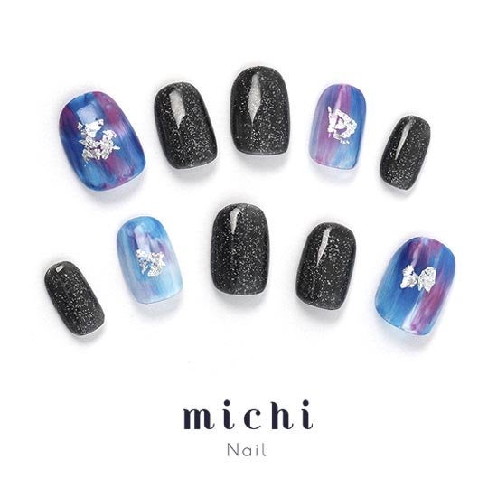 ダークで夜っぽい雰囲気のナイトパーティーネイル。ブラックとブルー系の相性が抜群で、モード系のファッションにもハロウィンのコスプレ衣装にも合わせられるネイルチップです。ラメ入りブラックカラーと銀箔のアートでキラキラ感も十分なネイルチップです。