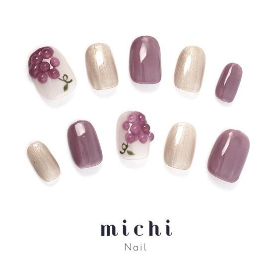 秋にピッタリのくすみパープルと立体感のあるぶどうアートが可愛いネイル。全体的に秋らしく、肌なじみのいいベースカラーなので、フルーツネイルの中でも使いやすいデザインです。ブドウのプルプル感と上品な色味で、毎日使いたい秋ネイルです。
