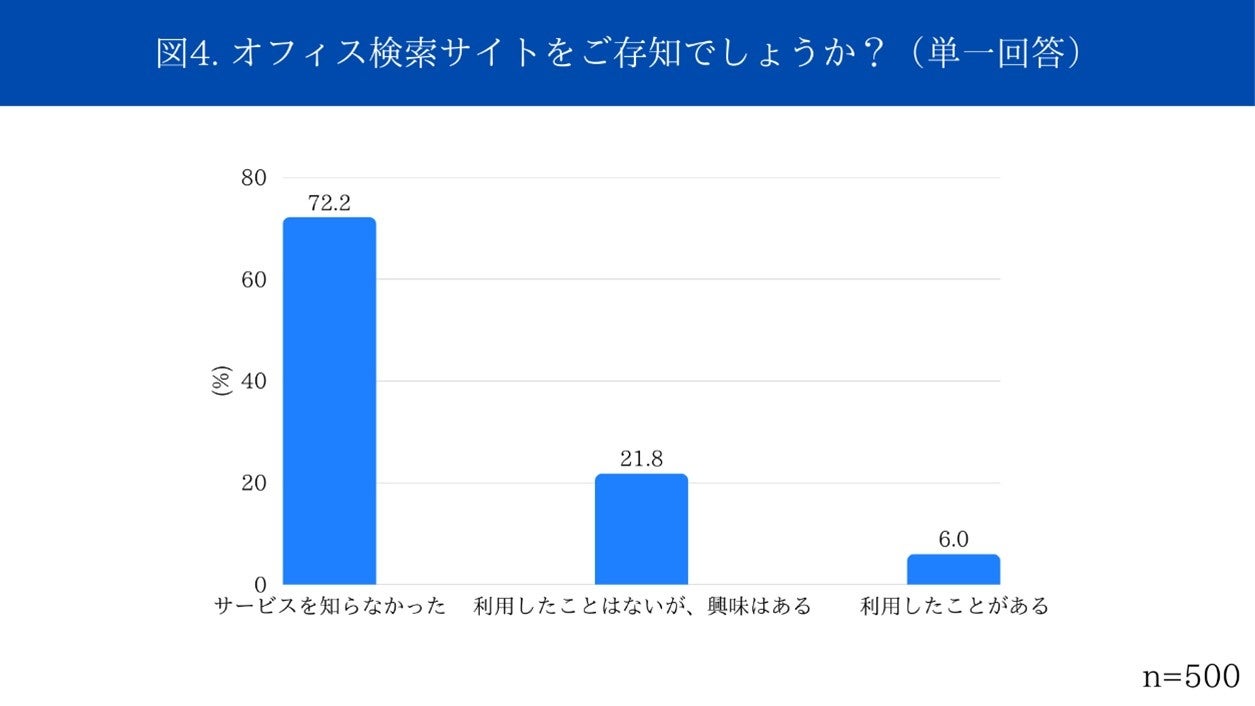 スタートアップ経営層の約7割が、オフィス検索サイトというサービス自体を「知らなかった」と回答しており、オフィス探しにおいて必要な情報にたどり着きにくい状況にあることがうかがえます。