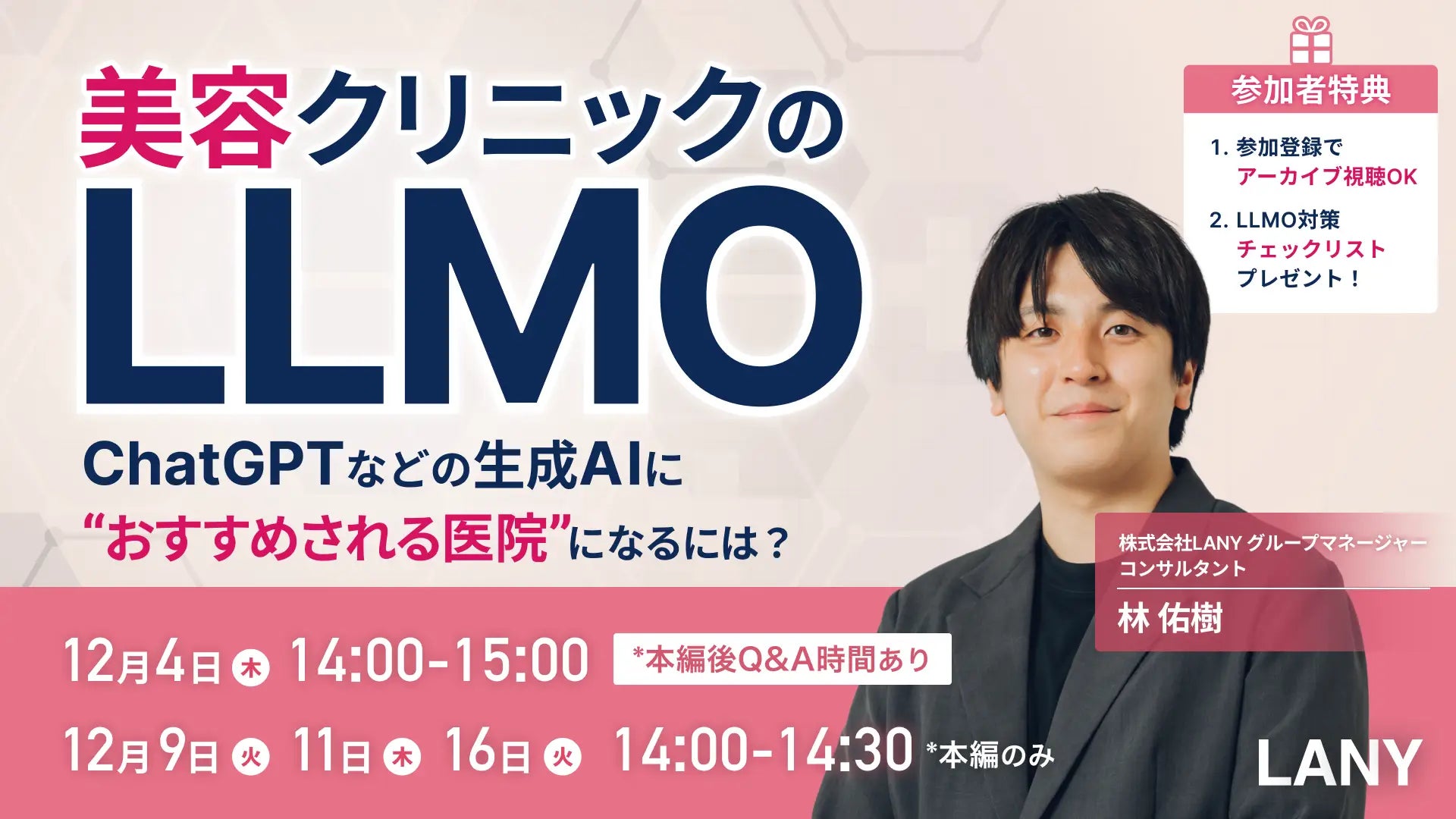 【無料ウェビナー】美容クリニックのLLMO━ChatGPTなどの生成AIに“おすすめされる医院”になるには?(アーカイブ視聴権あり)を12/4(木)~16(火)に開催