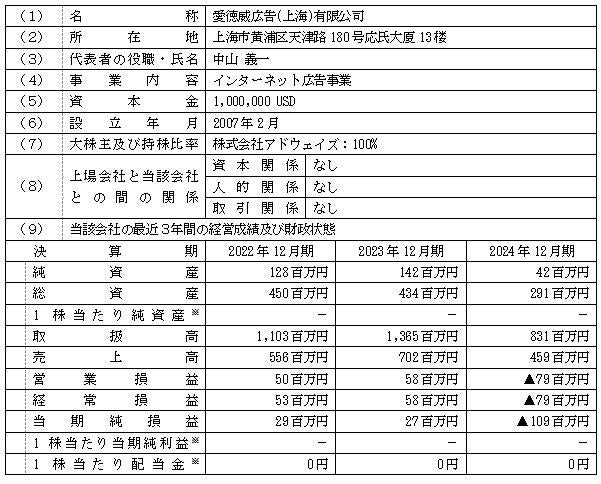 ADWAYS CHINA及びADWAYS ASIAについて、譲渡対象事業における2025年12月期の実績見通しは、年間取扱高36億円、売上高(売上総利益)5.2億円、営業利益18百万円(黒字)であります。