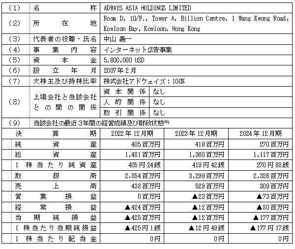 なお、ADWAYS ASIAは広告事業以外も営んでおり、それらの事業、資産及び負債等は分割予定の子会社に譲渡される予定です。