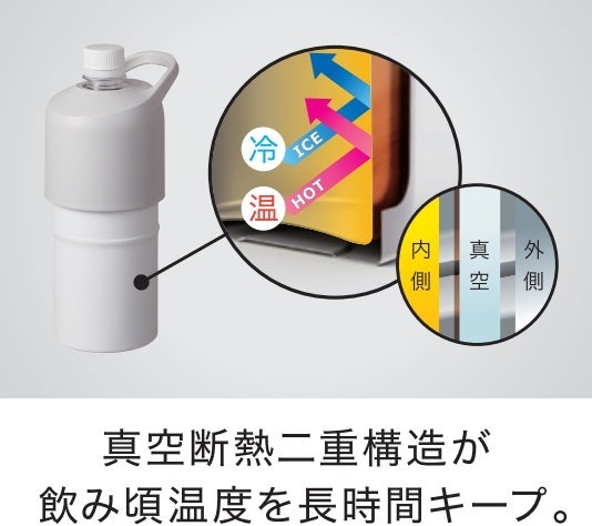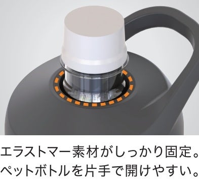 真空断熱二重構造のため外気の影響を受けにくく、買った時の飲み頃の温度を長時間しっかりキープ。ゴム弾性を有するエラストマー素材がペットボトルをしっかり固定するため、キャップが回しやすい仕様です。