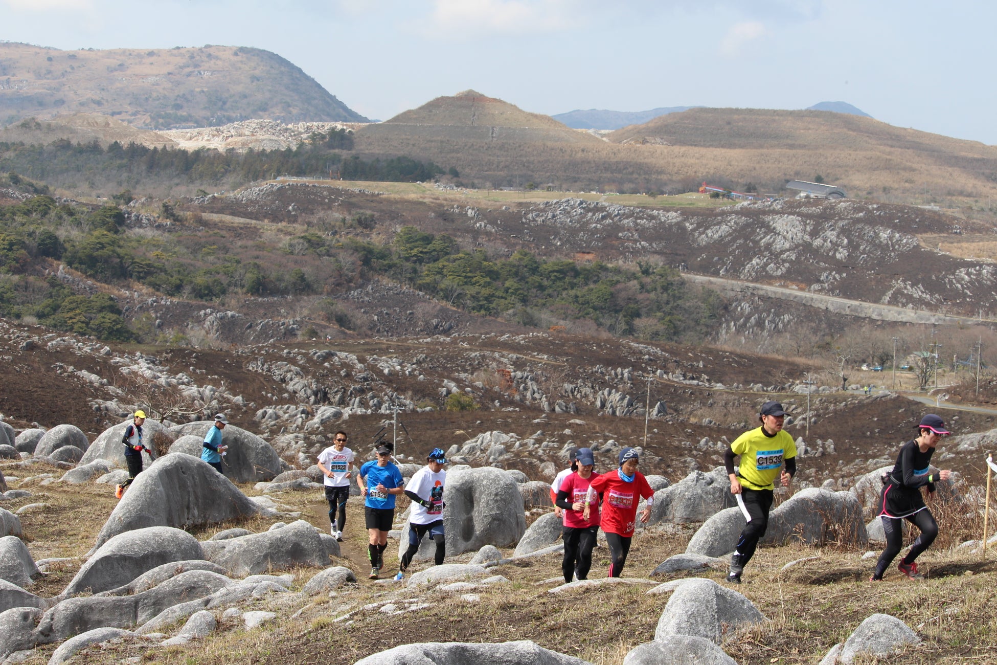 早春のキンと張りつめた冷気の中、山で羊の群れが遊んでいるような石灰岩の広がる台地「羊群原(ようぐんばる)」を毎年約800名のランナーが爽快に駆け抜けます。